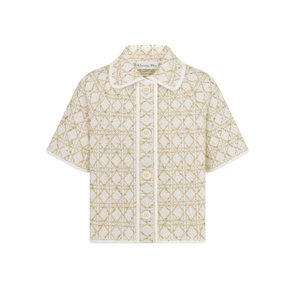 Elevate evening looks by matching the jacket with a gold-toned slip skirt or satin camisole. Accessorize with minimalist CD horn-button clutches and nude pumps to let the Cannage pattern shine. Complete the ensemble with delicate gold jewelry for a cohesive "White Gold" aesthetic.