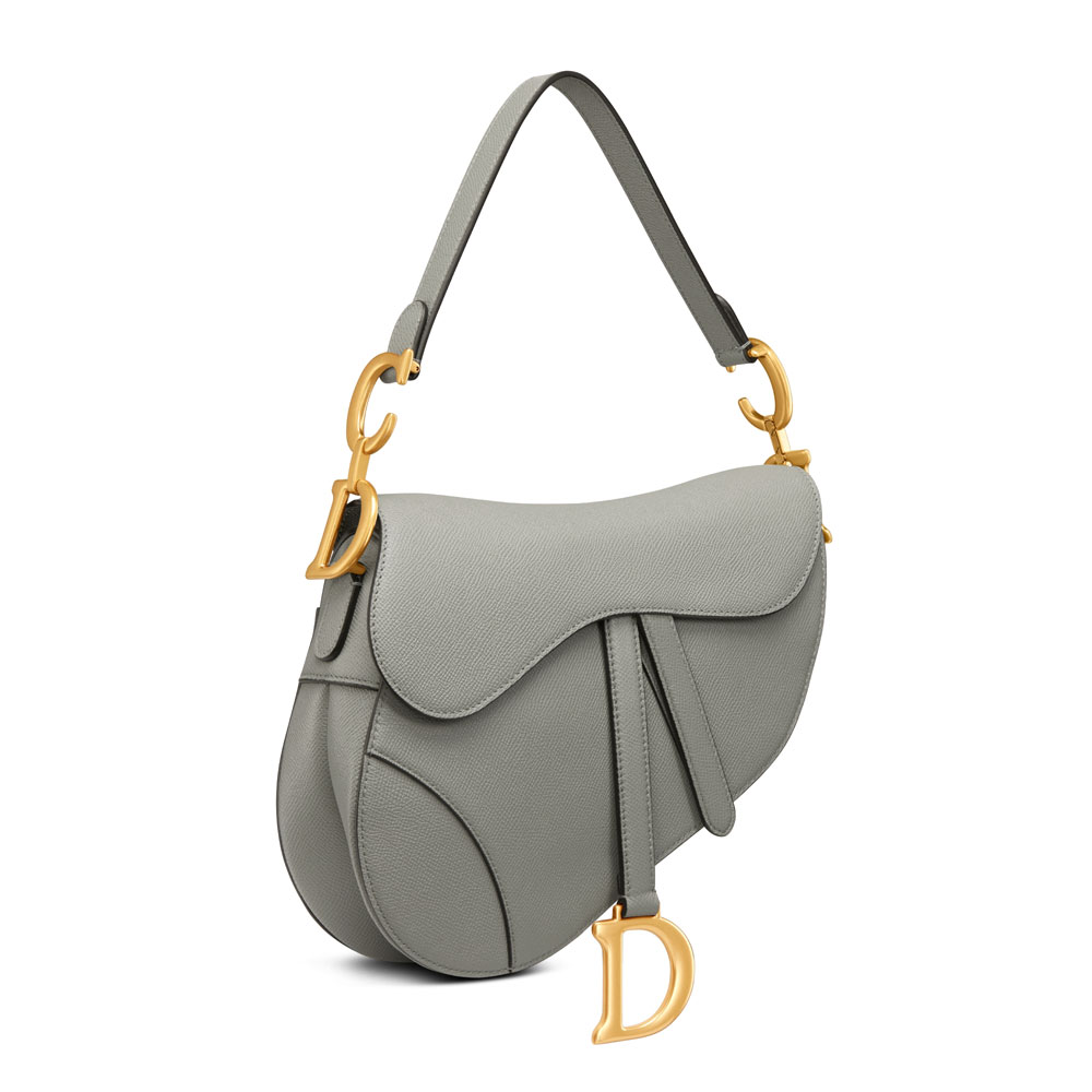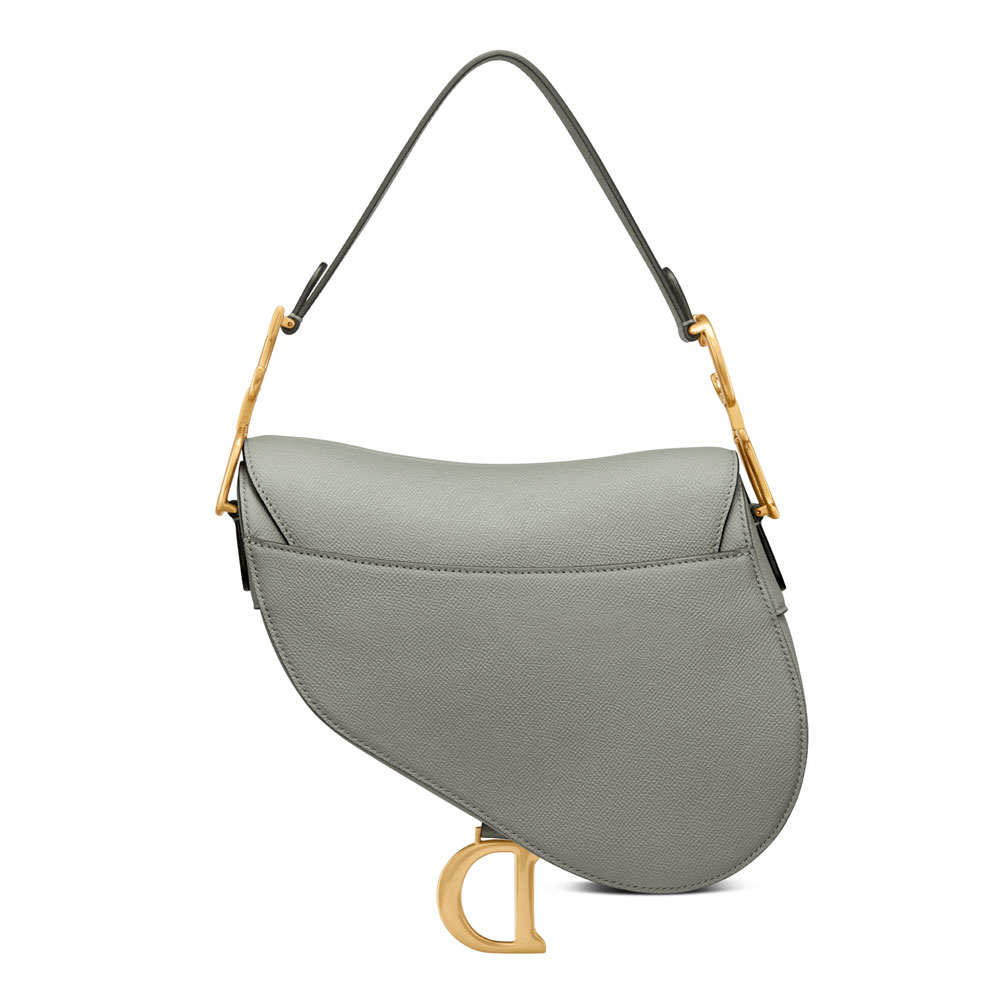 Maria Grazia Chiuri reimagines the timeless Saddle bag with modern touches. The updated design highlights a sculptural flap secured by a D-shaped stirrup and magnetic fastening, complemented by antique gold-tone metal accents along its signature top handles. Crafted from ash-gray leather with a textured finish, this piece offers dual functionality through an adjustable crossbody strap that converts to shoulder or hand-carry modes. Its refined structure includes a slim profile and reinforced leather lining, maintaining brand heritage while enhancing practicality. Key elements include: -Re-engineered flap closure system -Dual-tone hardware finishes -Ergonomic carrying options -Durable leather construction