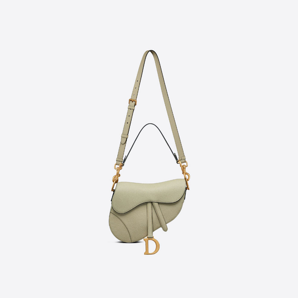 Maria Grazia Chiuri brings a fresh update to the iconic Saddle bag. Crafted in sage green grained calfskin. the legendary design features a Saddle flap with a magnetic 'D' stirrup clasp. as well as an antique gold-finish metal 'CD' signature on either side of the strap. Featuring a thin. adjustable and removable shoulder strap. the Saddle bag may be carried by hand. worn over the shoulder or crossbody.