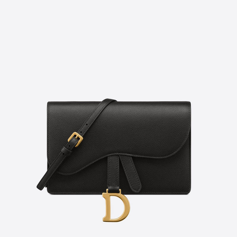 The pouch retains the emblematic codes of the Saddle line with its asymmetrical flap and antique gold-finish metal D stirrup magnetic clasp. Made with black grained calfskin, this accessory presents six card slots, three patch pockets and a zipped pocket. A removable leather shoulder strap may be replaced by an embroidered strap for a unique look.