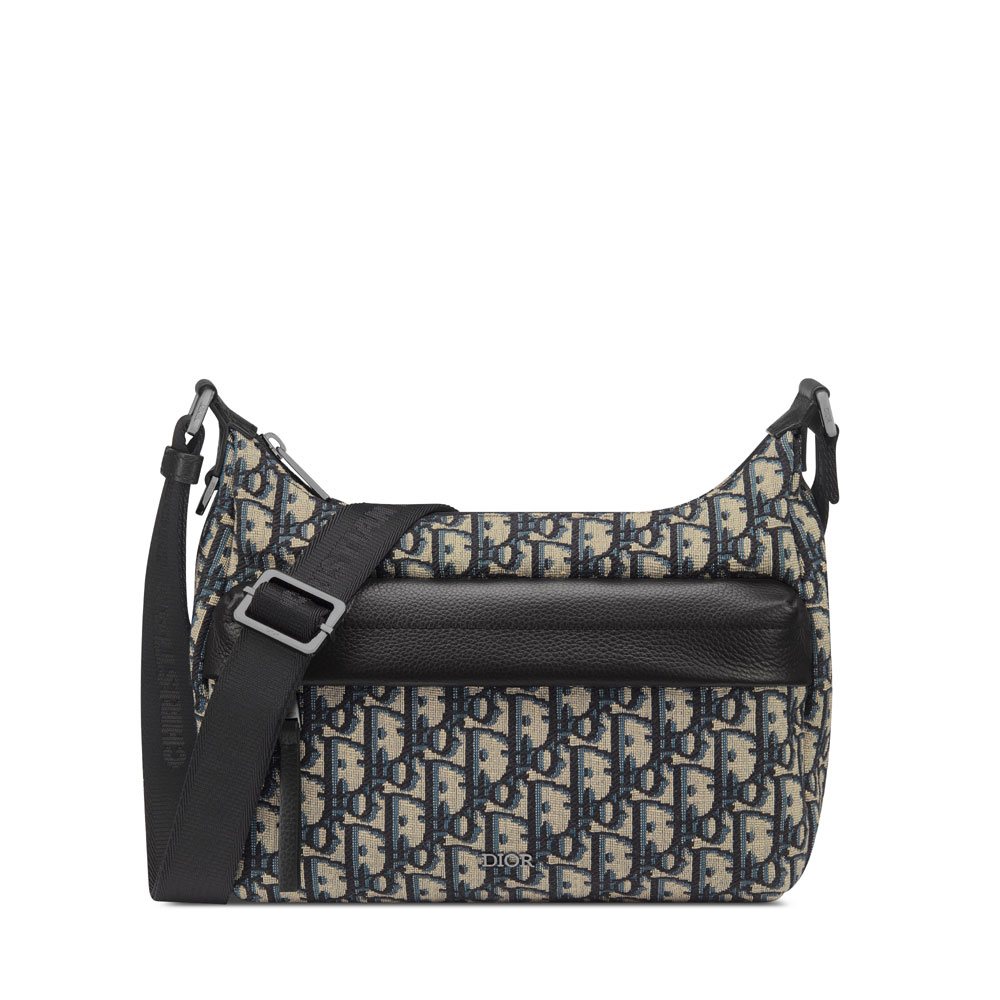 New for Fall 2025, this functional shoulder bag features adjustable straps for crossbody or shoulder wear. The contemporary design combines beige and black Dior Oblique jacquard with textured calfskin trims. Essential storage includes a main zippered section and front pocket. Crafted from cotton, technical fabric, and calfskin.