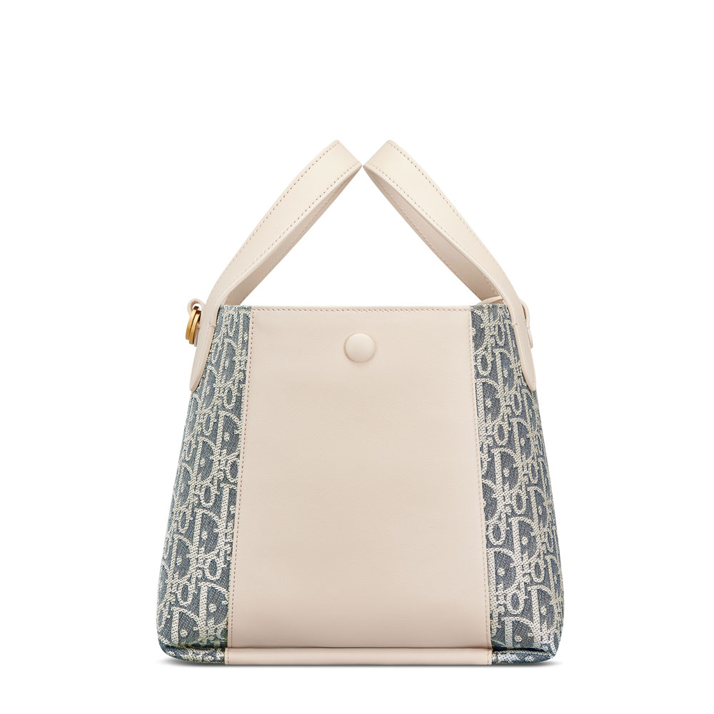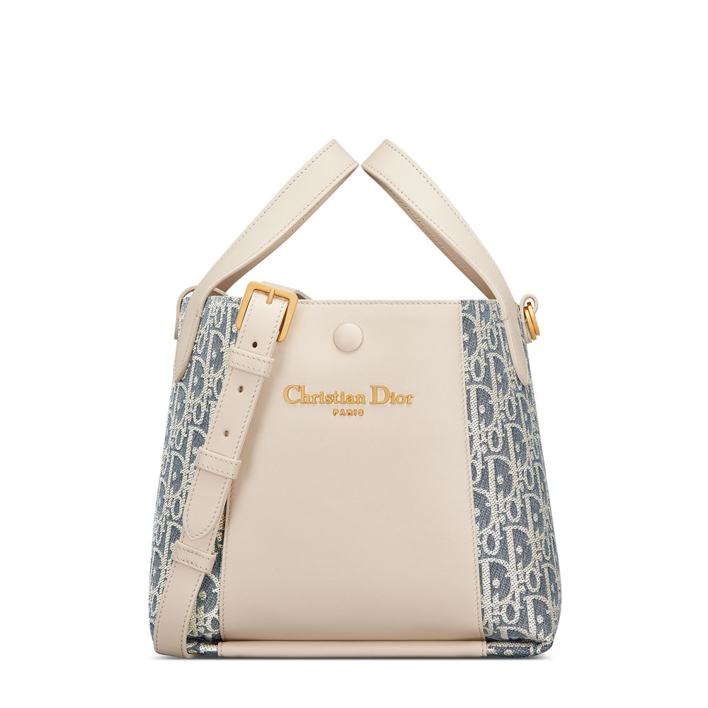 The Signature bucket bag highlights a sleek design with adaptable styling. Crafted from creamy, buttery leather and navy denim, this piece blends refined textures with Dior's iconic Oblique pattern, embroidered using resilient raffia threads on lightweight cotton canvas. Its roomy interior features a snap-tab closure for secure storage, eliminating the need for inner pockets.