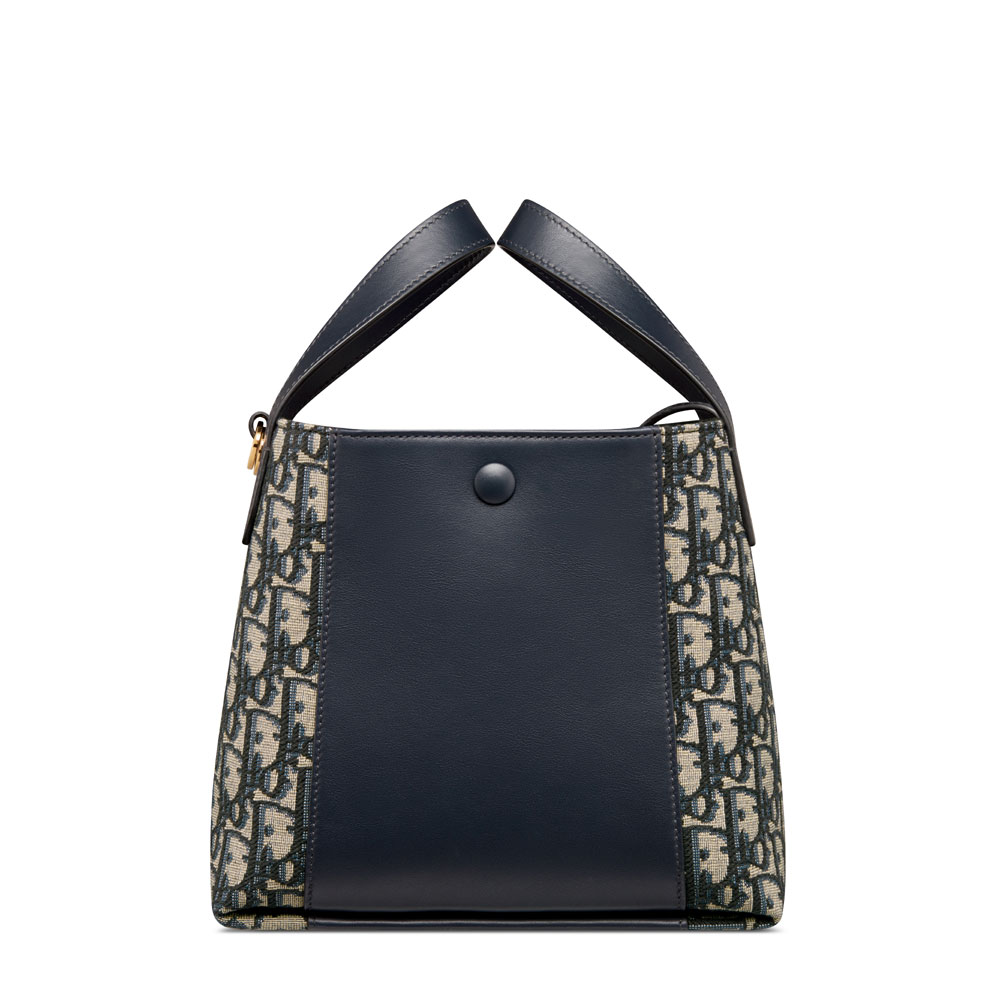 New for Summer 2025, the Signature bucket bag highlights a supple silhouette with multi-functional style. Crafted from blue Dior Oblique jacquard with tonal calfskin accents, it features an antique gold-toned metal Christian Dior Paris emblem at the front. The roomy interior includes a snap-tab securement system complemented by a hidden slip pocket. Designed for practicality, the structured top handles pair with an adjustable crossbody strap for hands-free wear or shoulder carrying. Constructed with premium cotton, technical fabric, and supple calfskin lining. Finishing touches include metal snap closures and durable leather strap attachments.