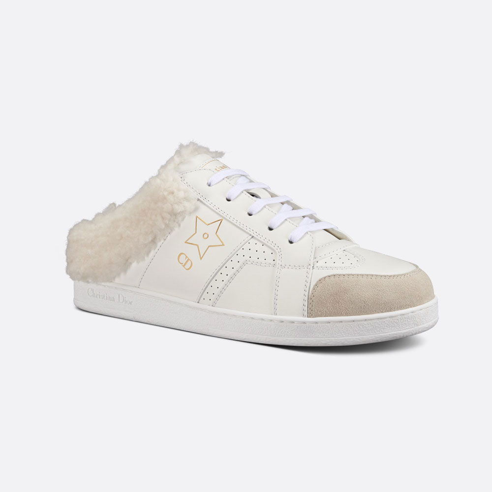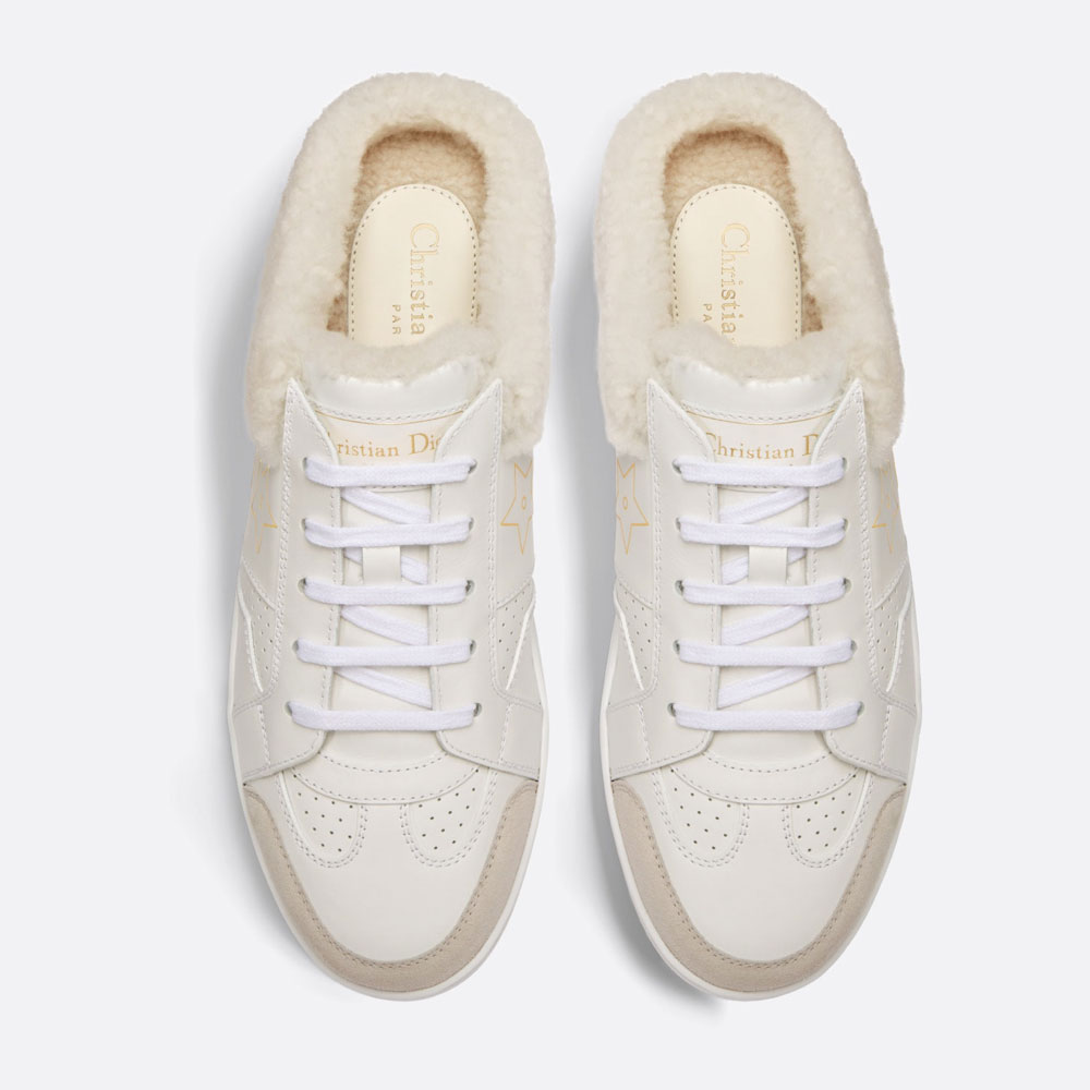 A new House essential, the Dior Star sneaker offers an ultra comfortable new silhouette. Crafted in white calfskin, it is enhanced by lining and a low heel tab in shearling. Gold-tone 'CD' and 'Christian Dior PARIS' signatures embellish the style. Featuring a branded thin sole, the lightweight sneaker will complete any relaxed attire, any time of year.