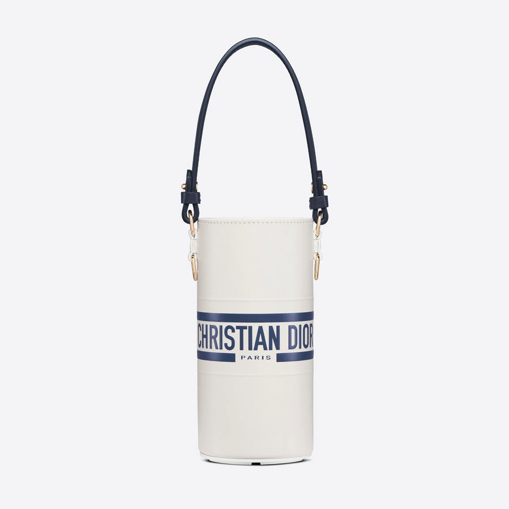 New this season. Maria Grazia Chiuri offers the Dior Vibe bottle holder. combining the couture spirit of the House with sportswear codes. Crafted in white calfskin. it is enhanced by a contrasting 'CHRISTIAN DIOR PARIS' signature. Featuring a detachable handle and a removable and adjustable shoulder strap. the bottle holder is a true on-the-go accessory that can be carried by hand or worn crossbody. Size:8 x 17CM