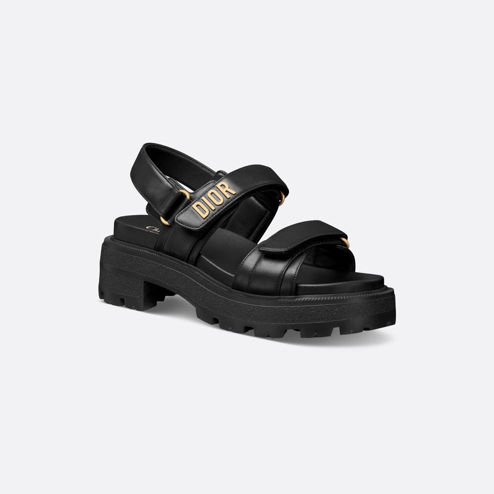 the Dioract sandal is recast into a modern platform. The anatomically shaped sole offers lightweight comfort. Crafted in black lambskin, it features self-fastening straps enhanced by a gold-finish metal Dior signature on the upper strap. The sandal will lend a contemporary touch to any look.