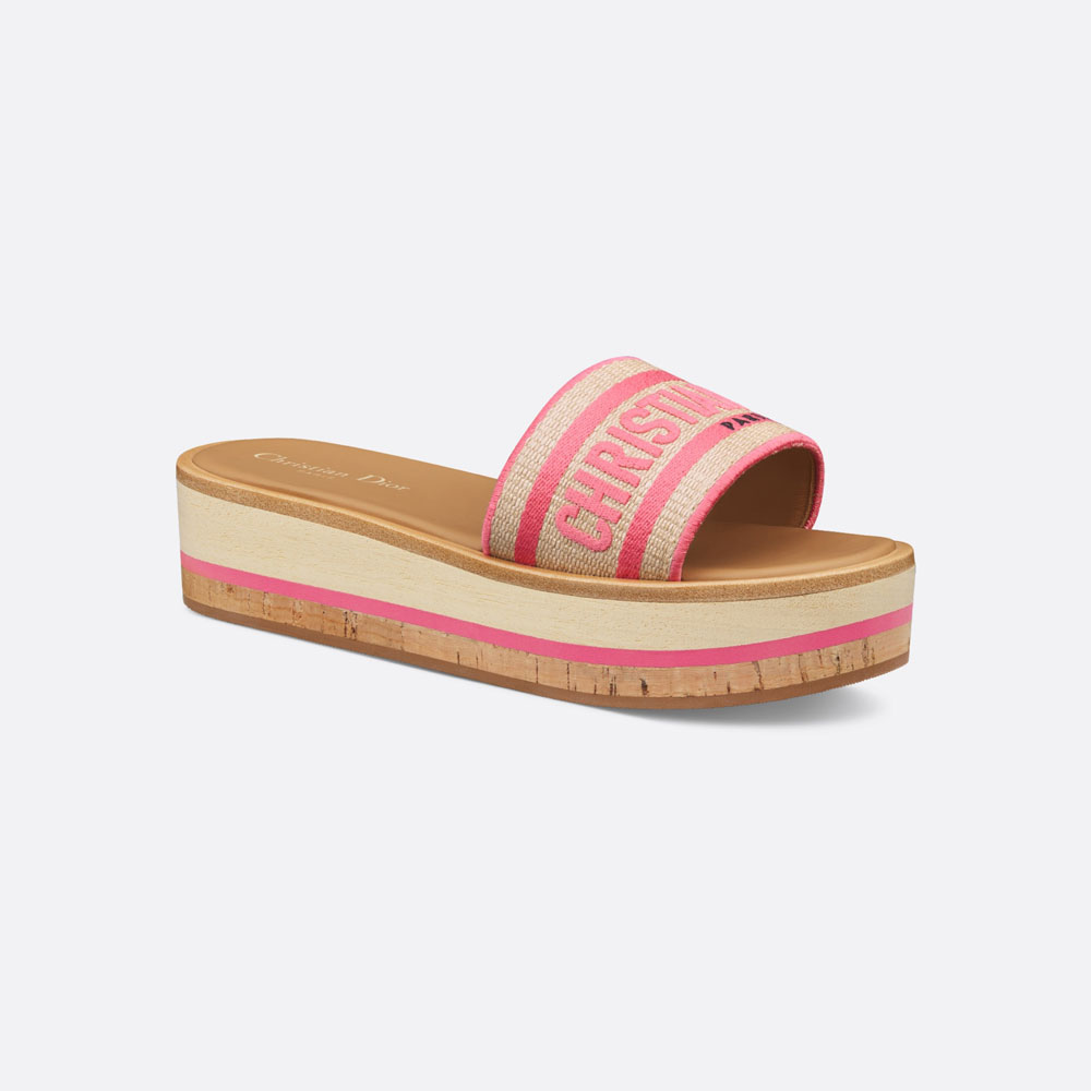 the Dway platform slide has a modern and casual look. The natural raffia and candy pink cotton upper is embroidered with the instantly recognizable Christian Dior Paris signature. Completed by a thick sole in wood, candy pink rubber and cork, the shoe can be coordinated with other creations from the Dioriviera capsule.