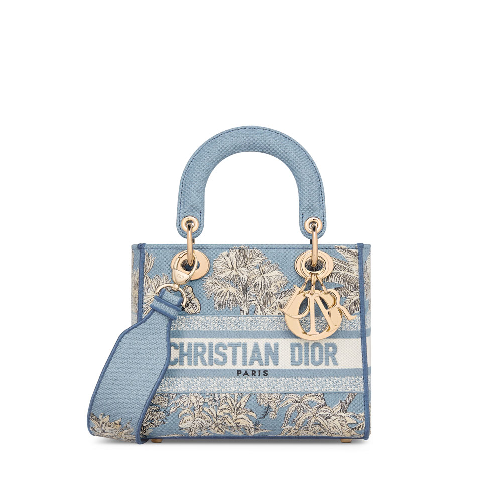 The Lady D-Lite bag blends timeless sophistication with contemporary flair. Adorned with Pietro Ruffo's celestial blue palm design, it showcases a lively jungle theme with various creatures.