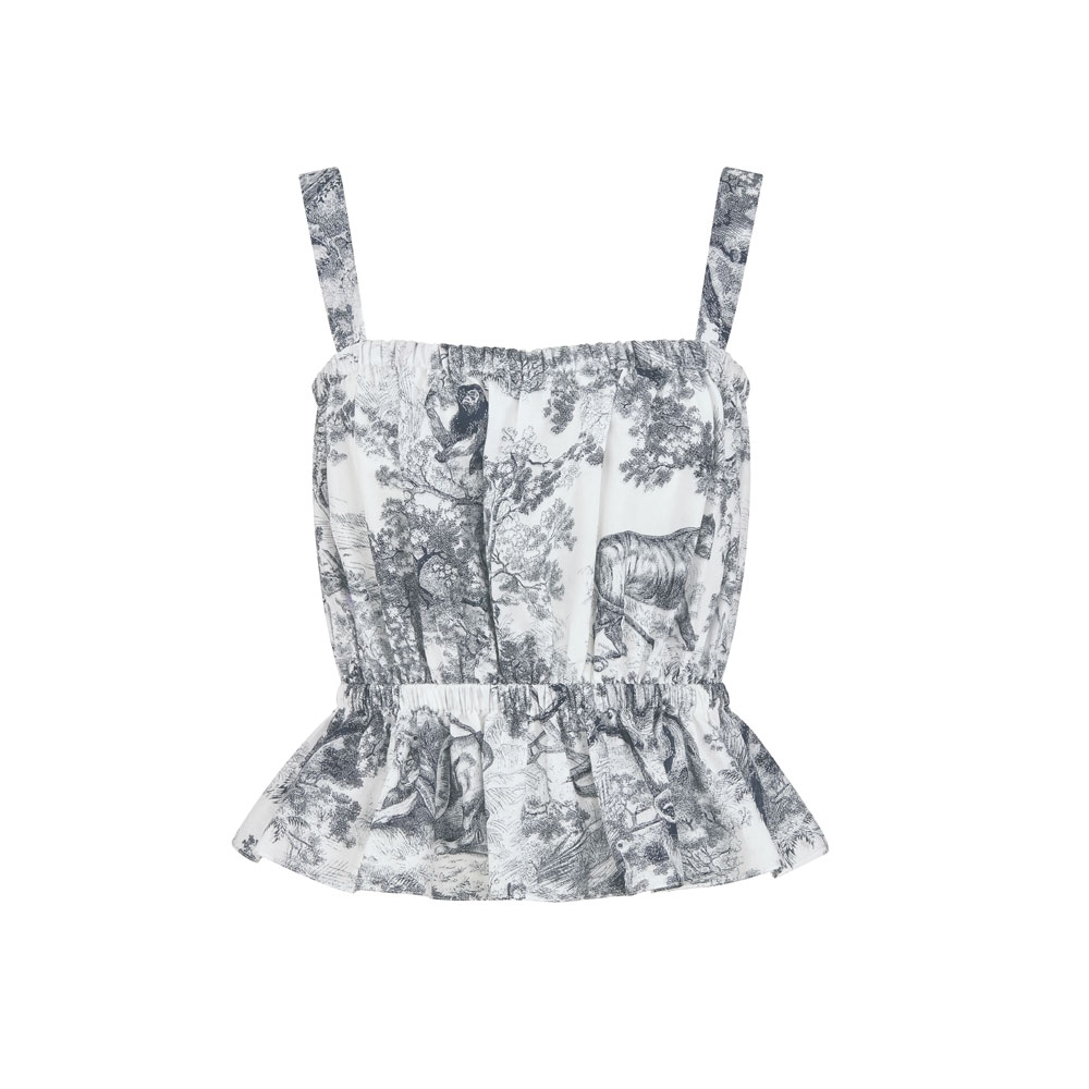 Styling the Dioriviera Top in White: This elegant Dior women clothing piece effortlessly transitions from resort wear to refined daytime ensembles. Pair it with tailored navy linen trousers for a crisp contrast, or layer over a matching Toile de Jouy Sauvage slip dress to amplify the collection's botanical theme.