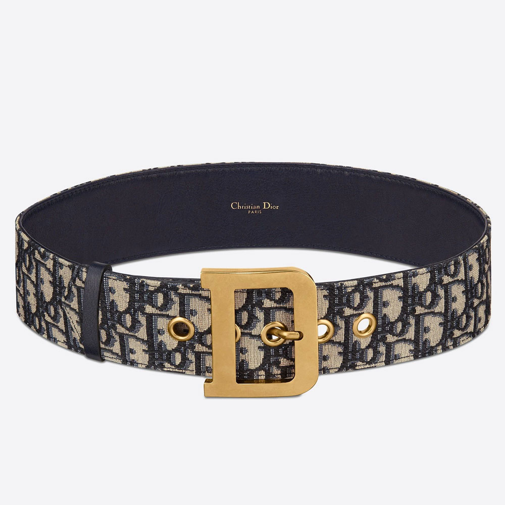 The hallmark Diorquake belt has a bold design. Crafted in blue Dior Oblique jacquard, the House classic, it features the iconic 'D' buckle in antique gold-finish metal. A refined style, its wide silhouette will elegantly highlight the waist and enhance a skirt, dress or Bar Jacket.