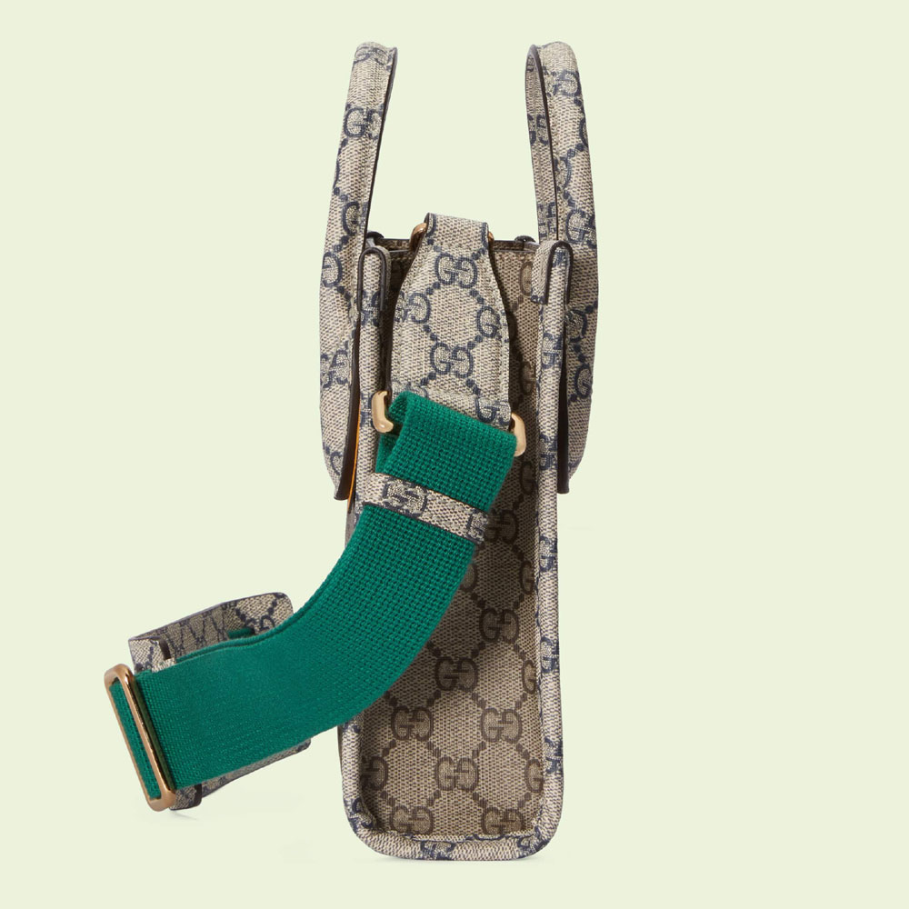 The name of the collection. 'Exquisite Gucci'. decorates a series of pieces from shoes to luggage. The multicolored print reflects the joyful narrative running through the travel selection. Here the signature GG Supreme canvas is presented in both blue and ebony variations for this mini tote. complete with contrasting trims