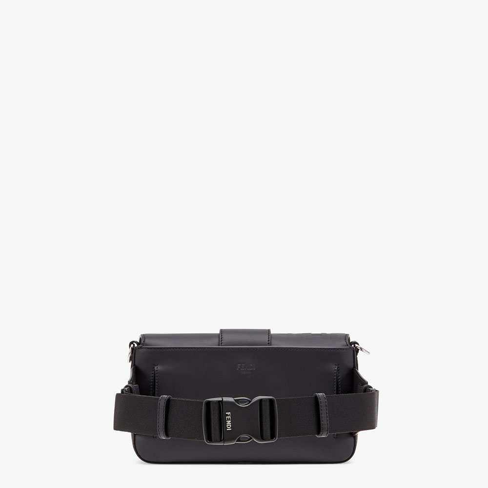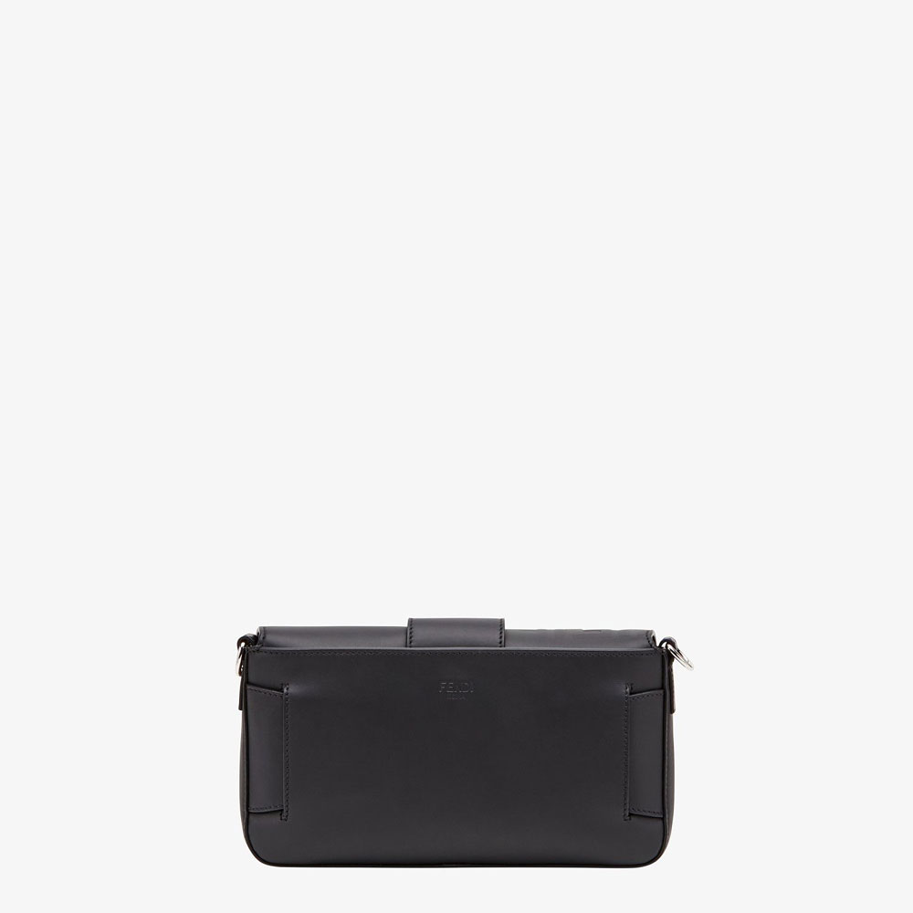 Regular Baguette with square flap and FF magnetic clasp. It can be worn either as a belt bag, using the strap that pulls out of the outer pocket on the back, or as a shoulder or cross-body bag by attaching the detachable shoulder straps. Lining with zipped pocket. Made of black calfskin. Finished with embossed, shaded FF motif. Palladium-finish metalware.
