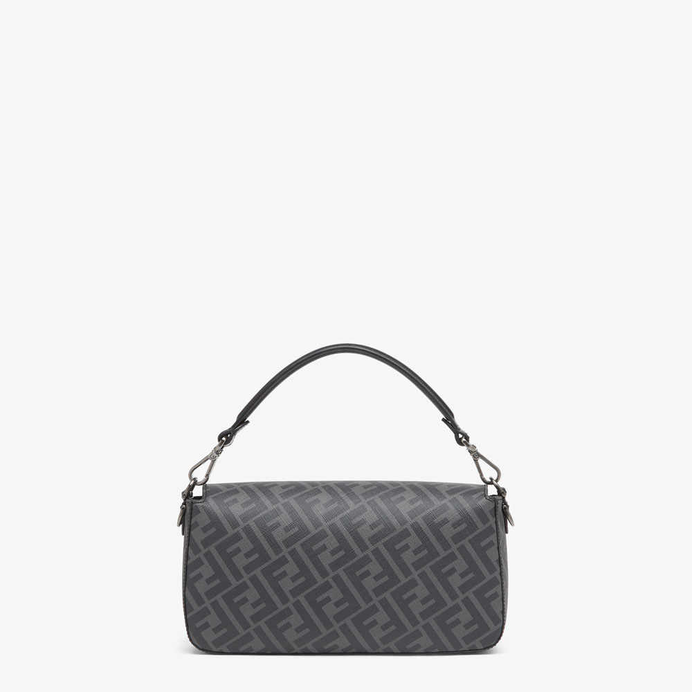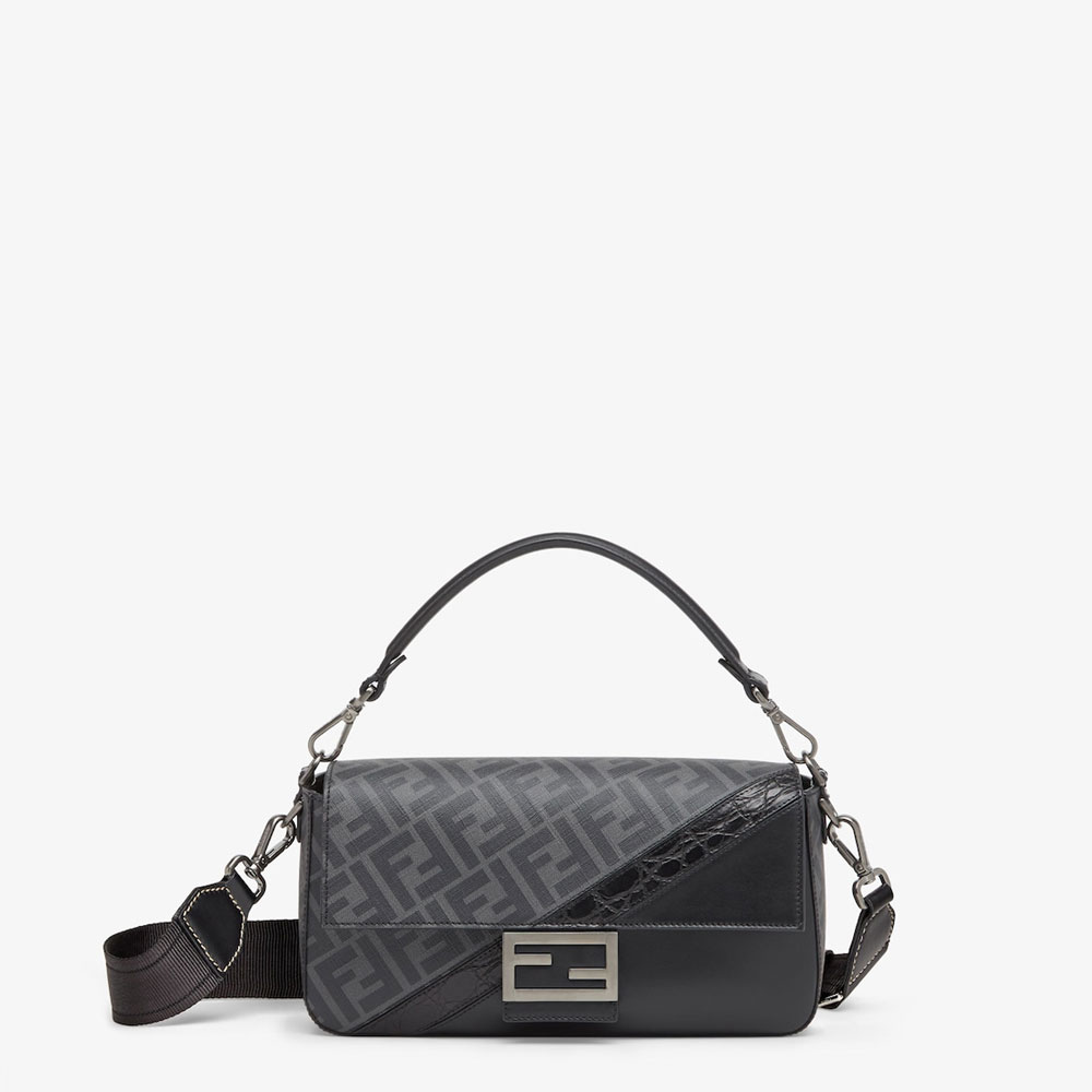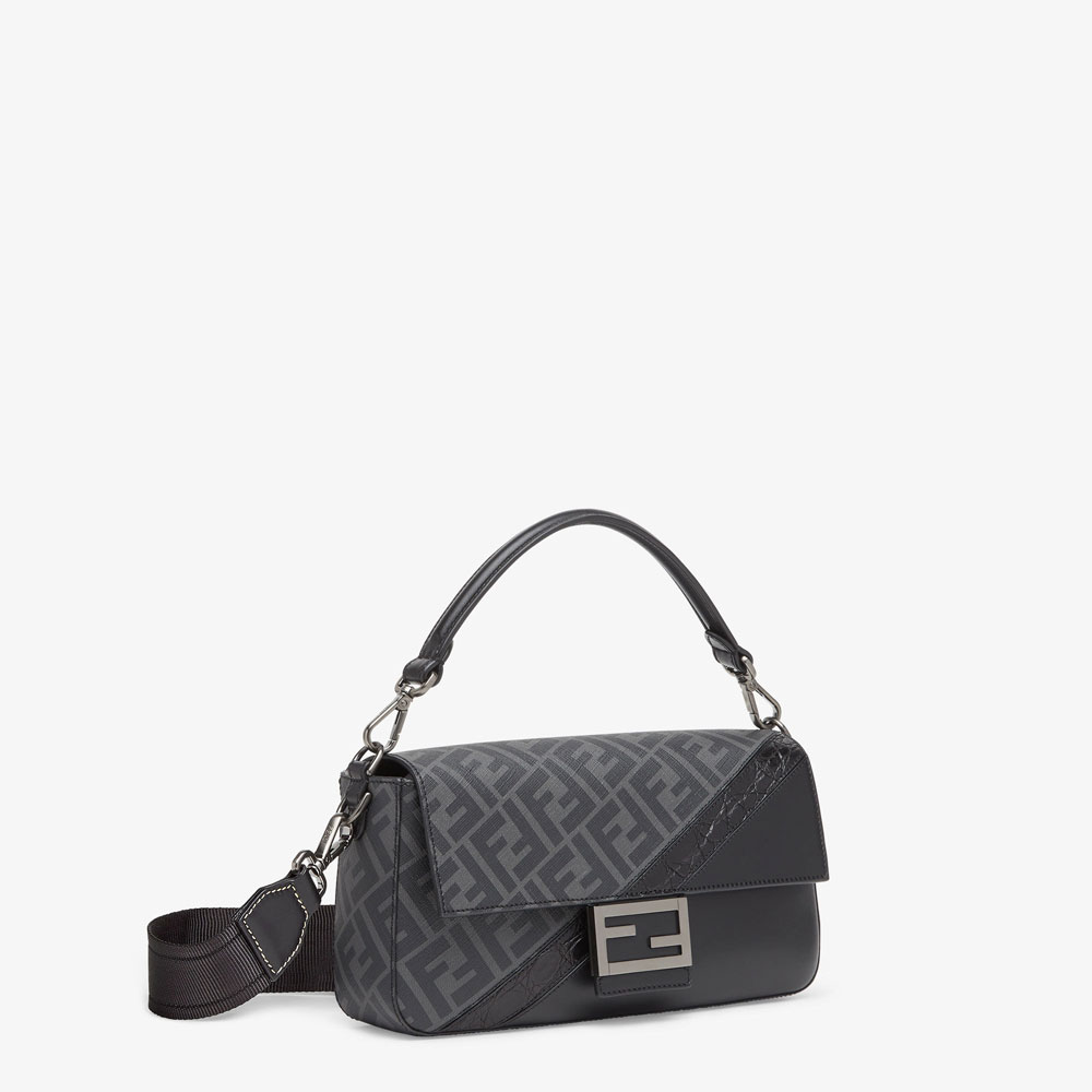 Baguette bag made of black leather and recycled fabric with jacquard FF motif in grey. Square flap and FF magnetic clasp