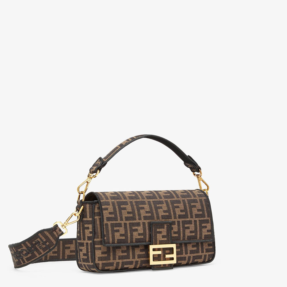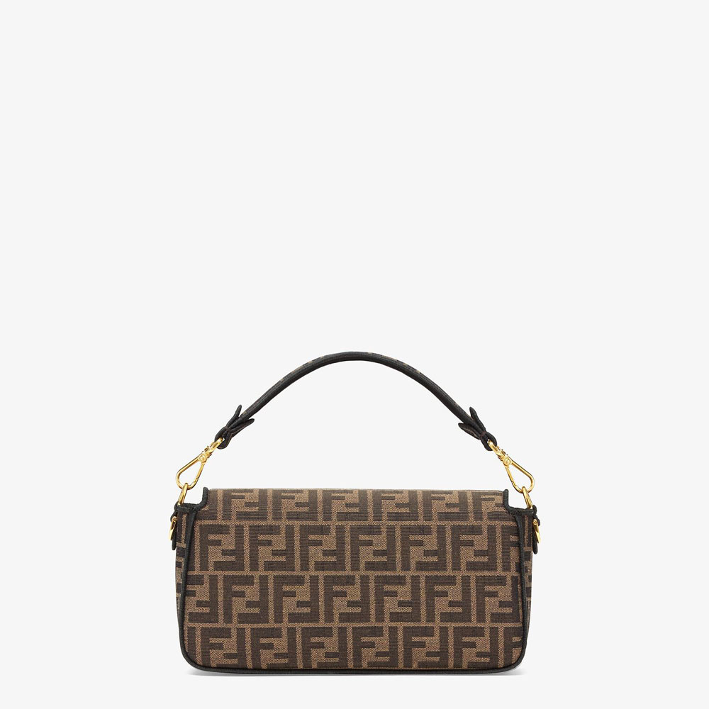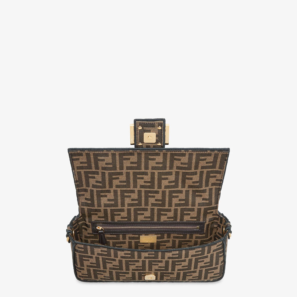 Iconic medium Baguette bag made of brown jacquard fabric with an FF motif, decorated with an FF clasp and trimmed with black embroidery.