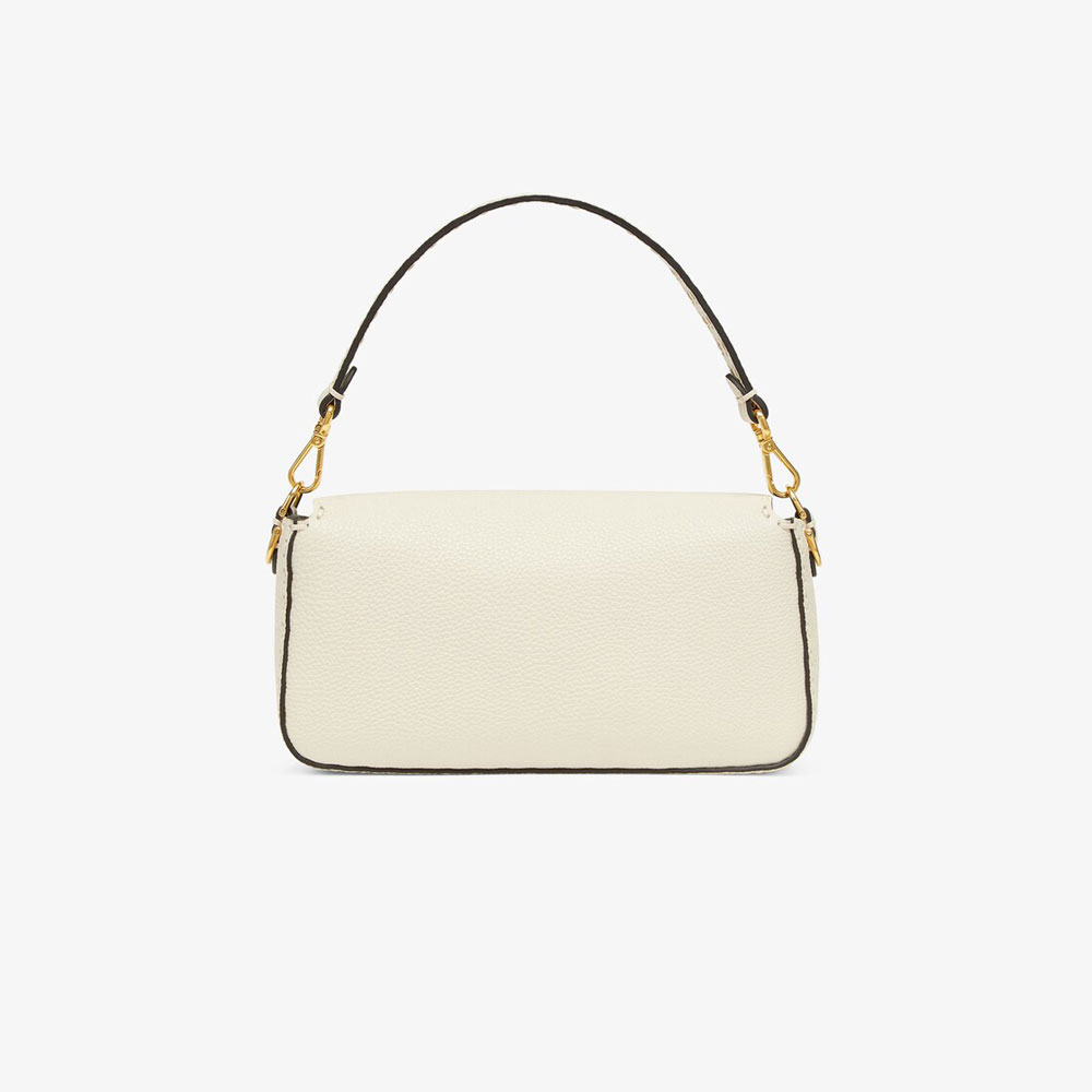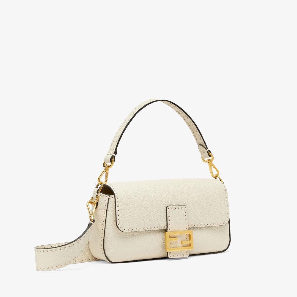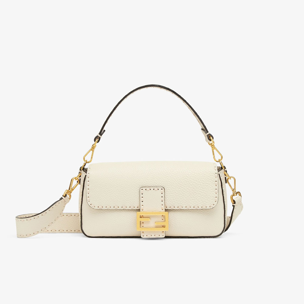 Iconic medium Baguette bag, made of camellia Cuoio Romano leather embellished by hand with matching-tone stitching. Decorated with an FF clasp.