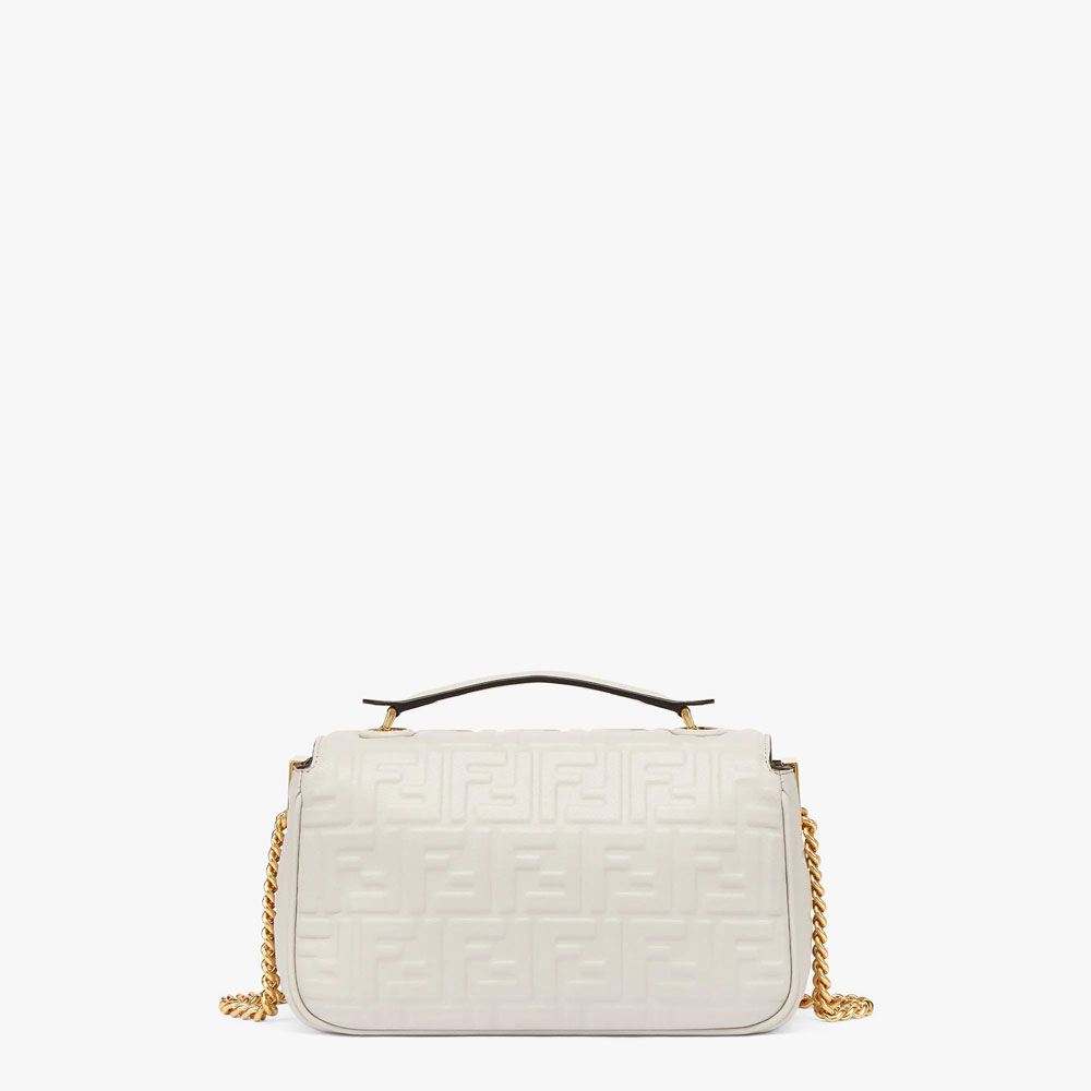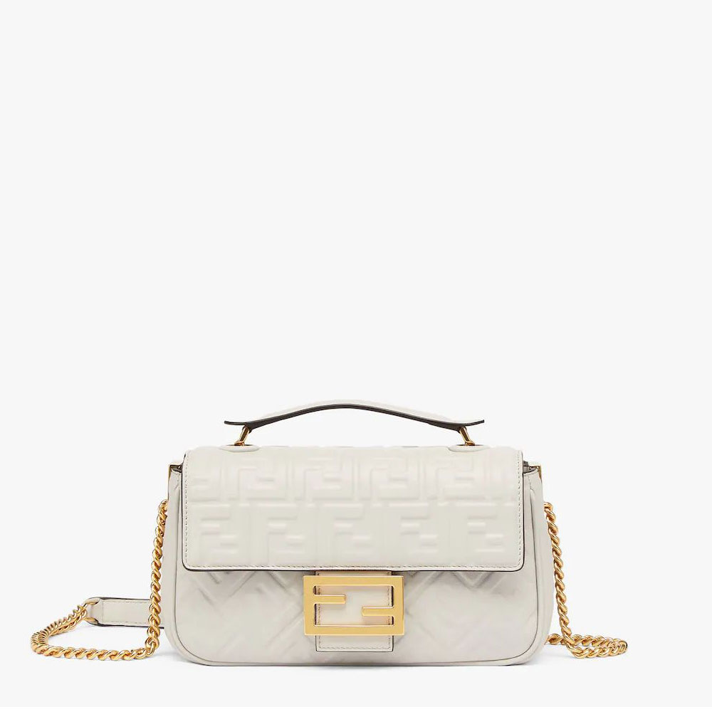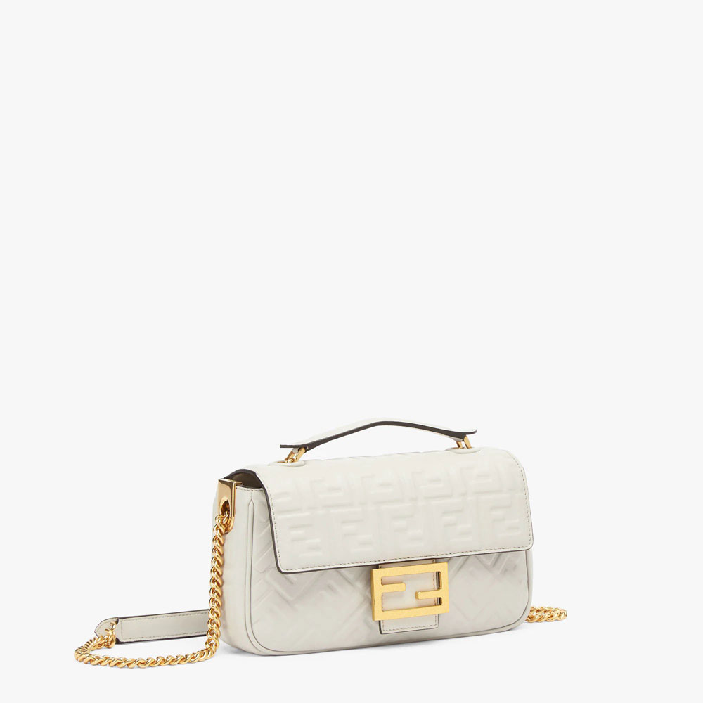 Iconic medium Baguette bag with chain. made of light grey soft nappa leather with a 3D texture FF motif. Embellished with an FF clasp.