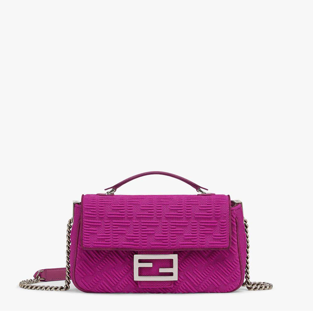 Iconic medium Baguette bag with chain shoulder strap. made of purple technical mesh with a 3D texture FF motif. Decorated with an FF clasp.