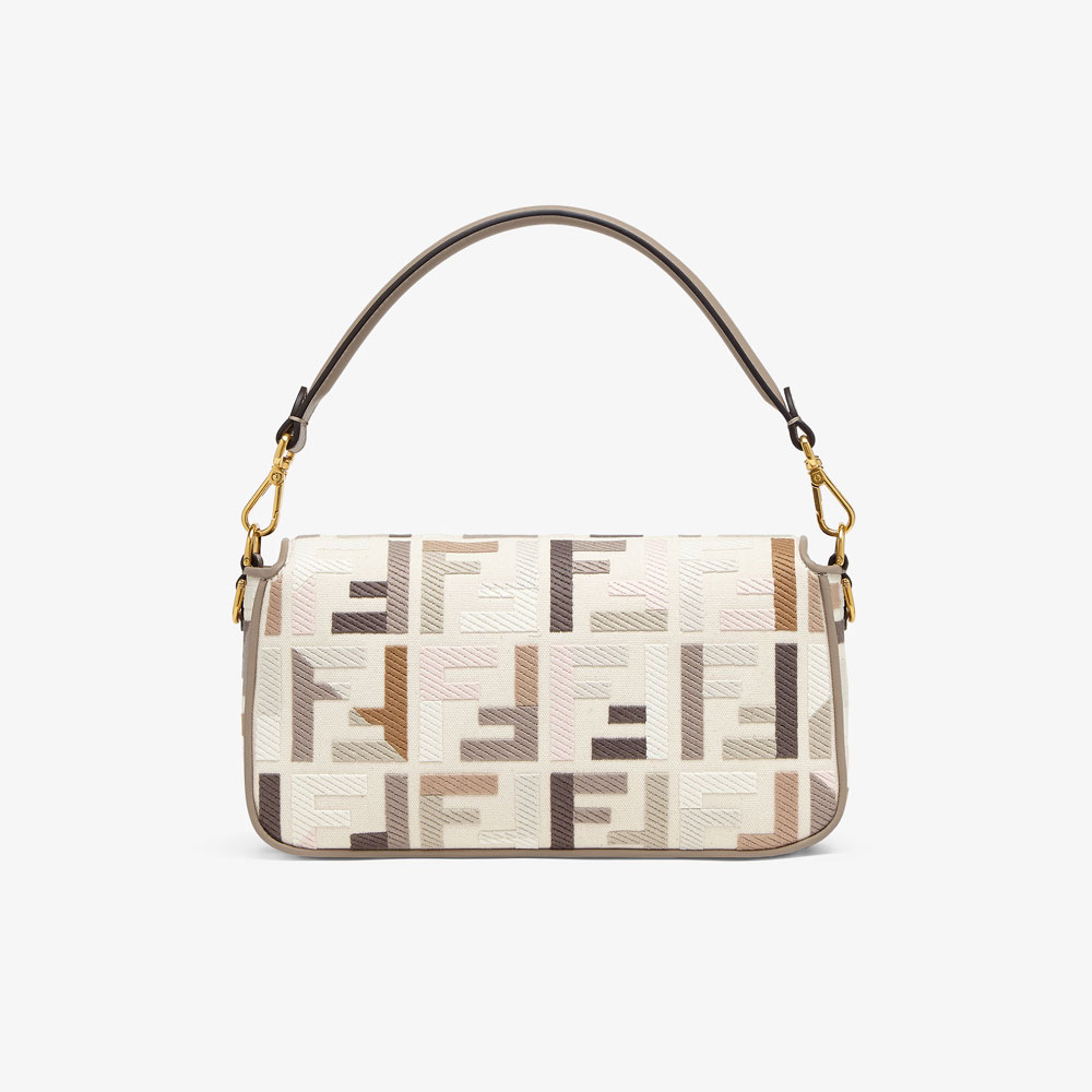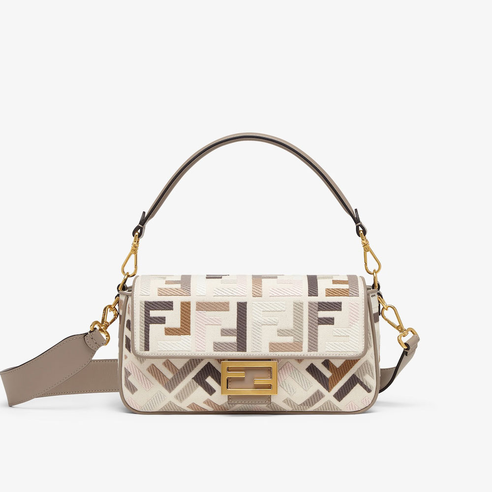Iconic medium Baguette bag. made of natural-colour canvas with a raised FF motif embroidered in multicolour yarn. Finished with a dove grey leather trim and embellished with an FF clasp.
