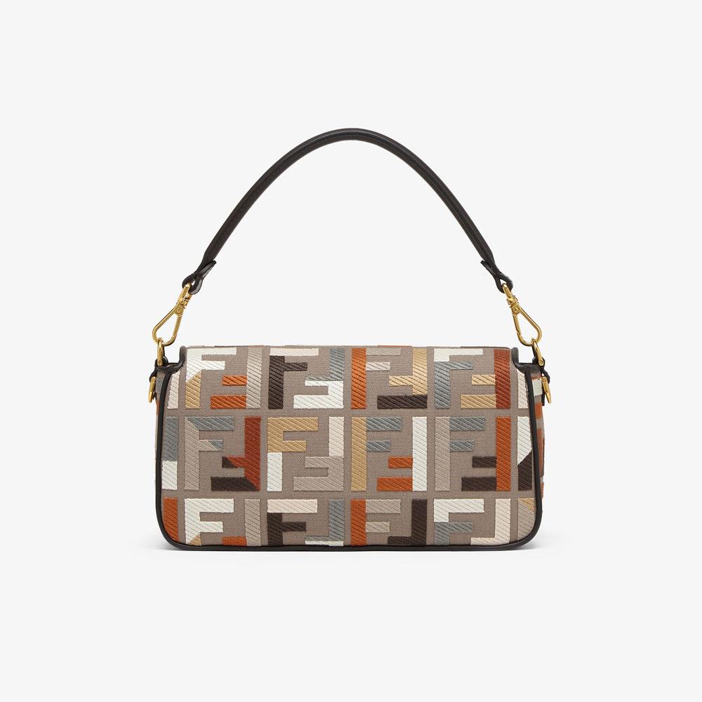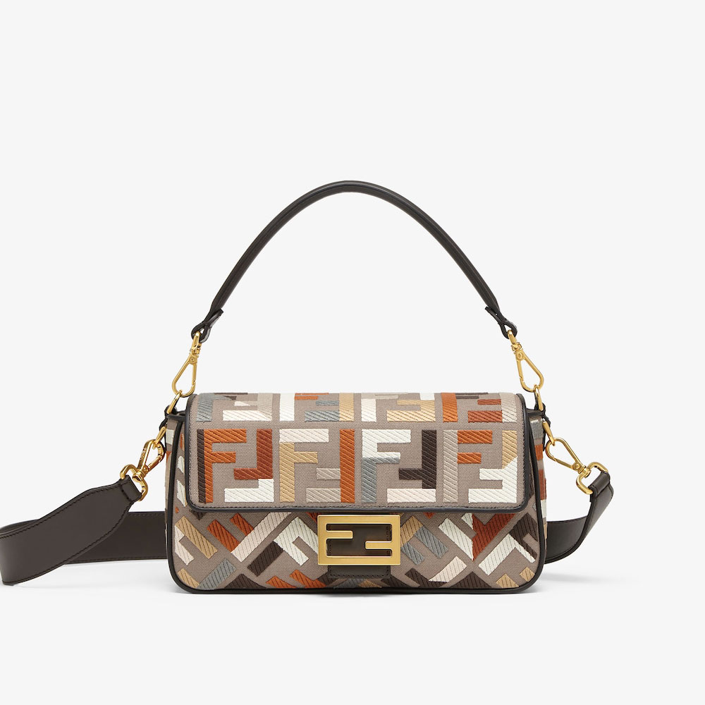 Iconic medium Baguette bag. made of grey canvas with a raised FF motif embroidered in multicolour yarn. Finished with a dark brown leather trim and embellished with an FF clasp.