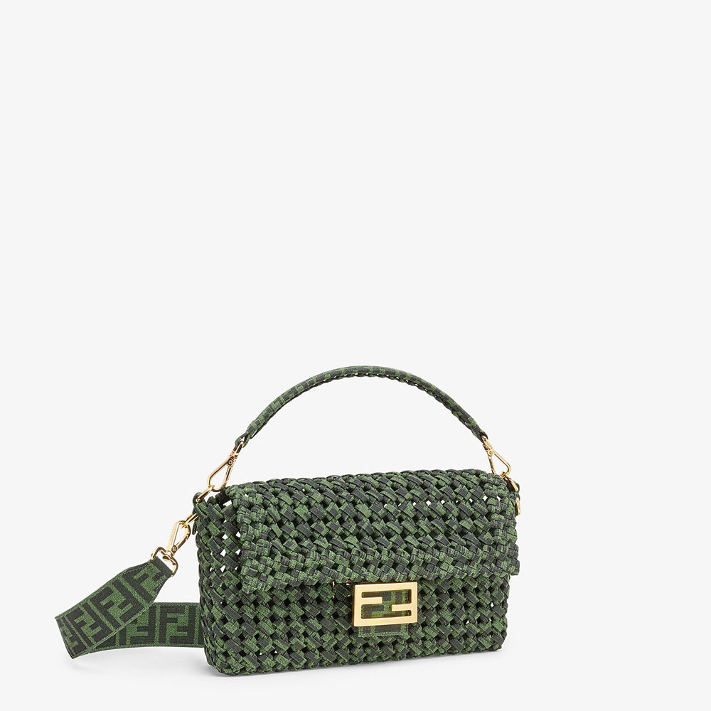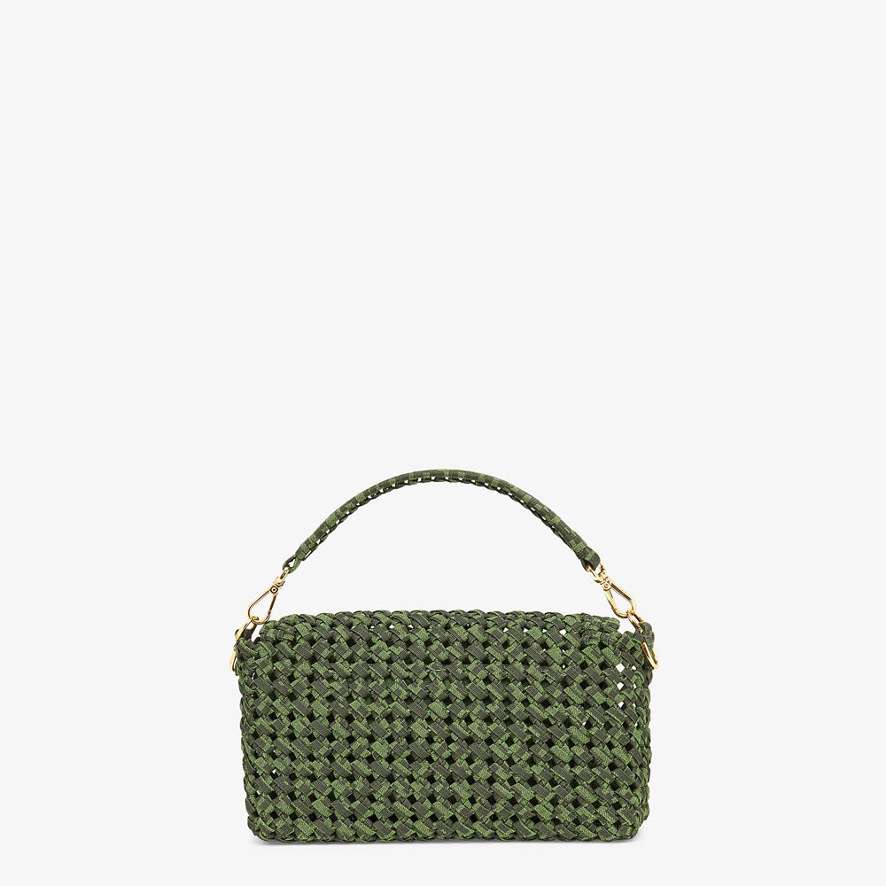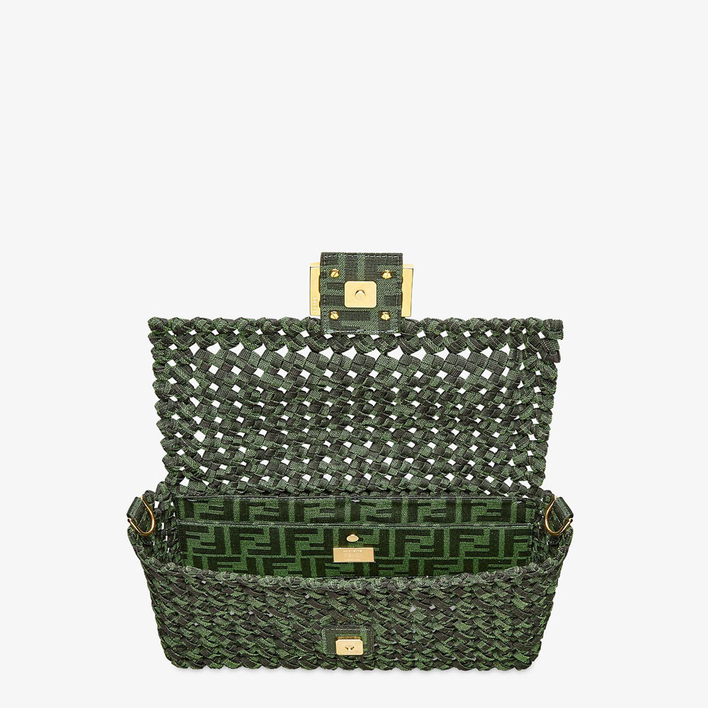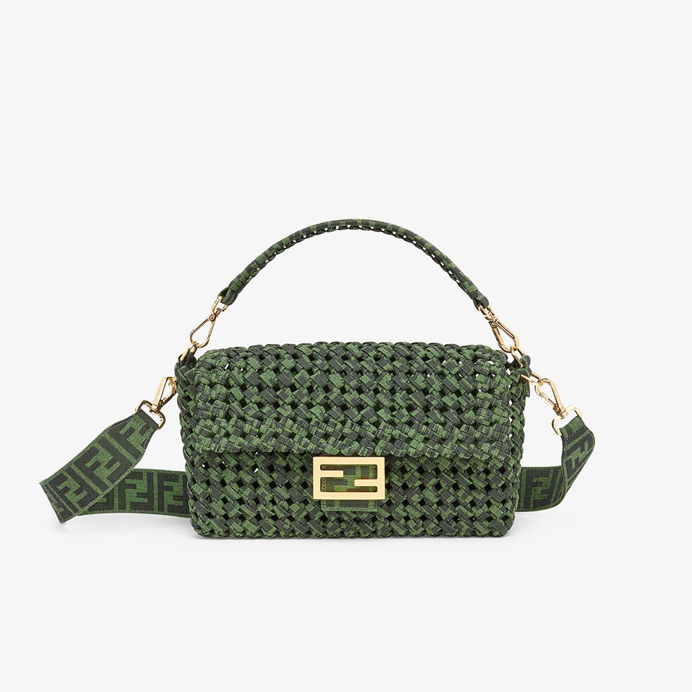Iconic medium Baguette bag made from woven strips of green FF jacquard fabric and embellished with an FF clasp. Totally leather-free.