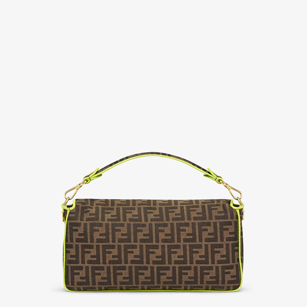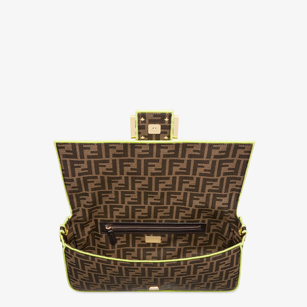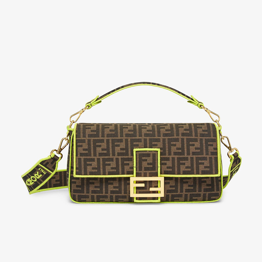 Iconic large Baguette bag made of brown jacquard fabric with an FF motif, decorated with an FF clasp and trimmed with neon yellow embroidered edges.