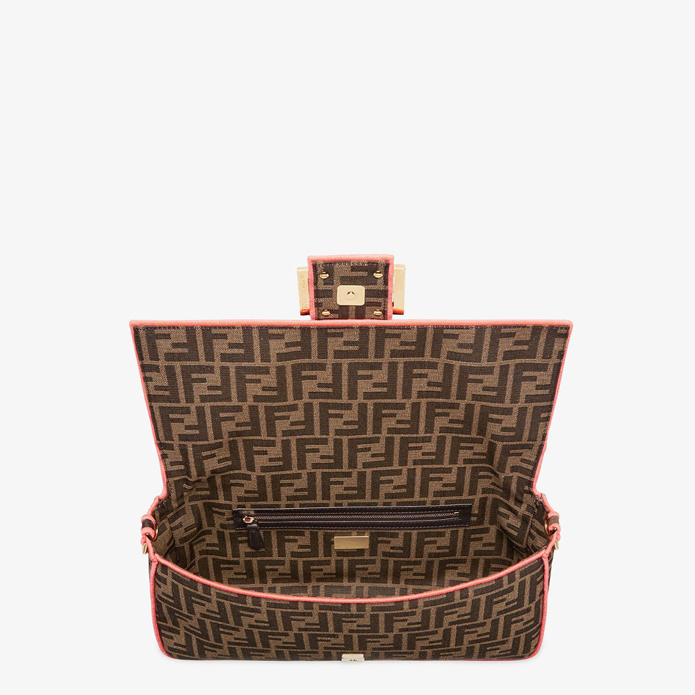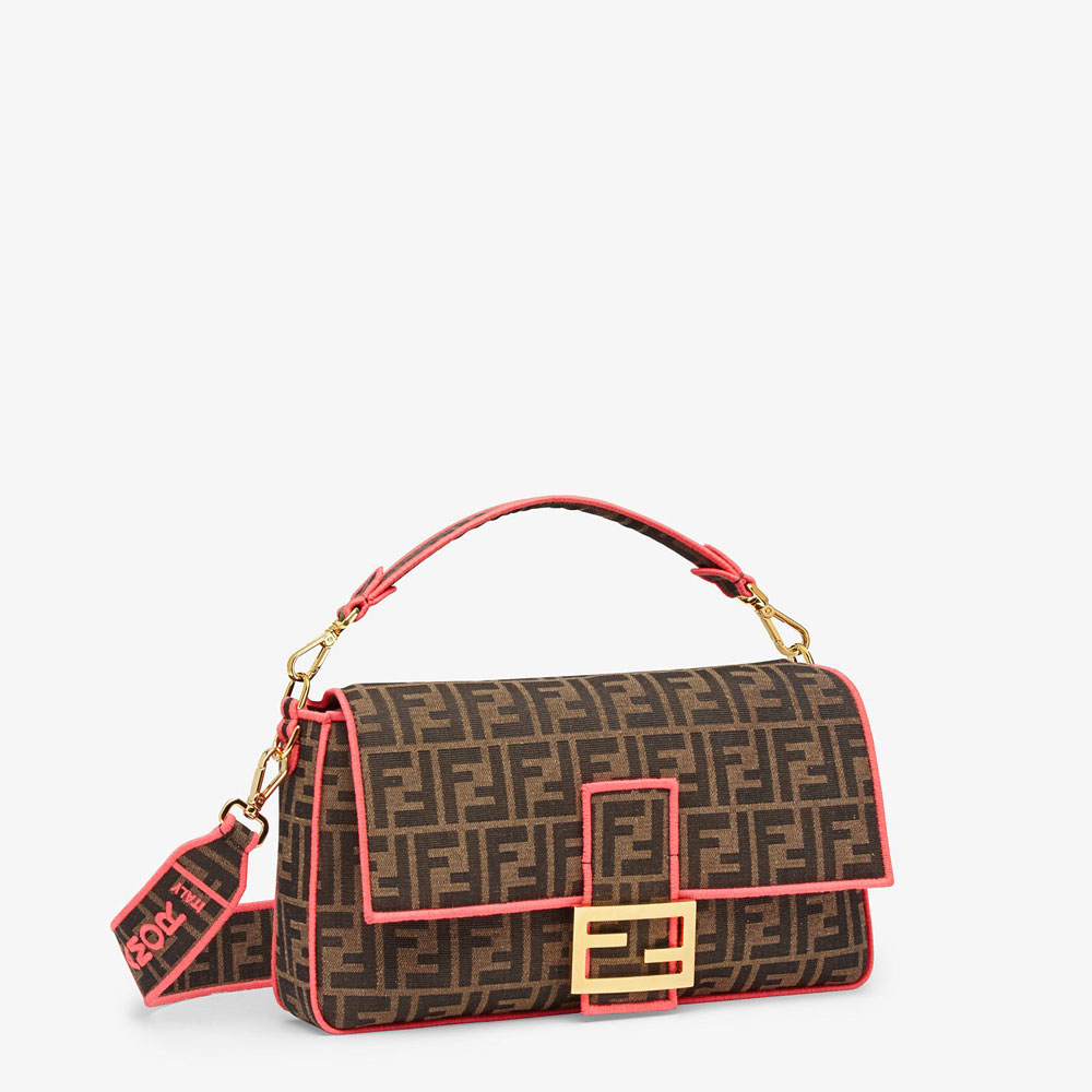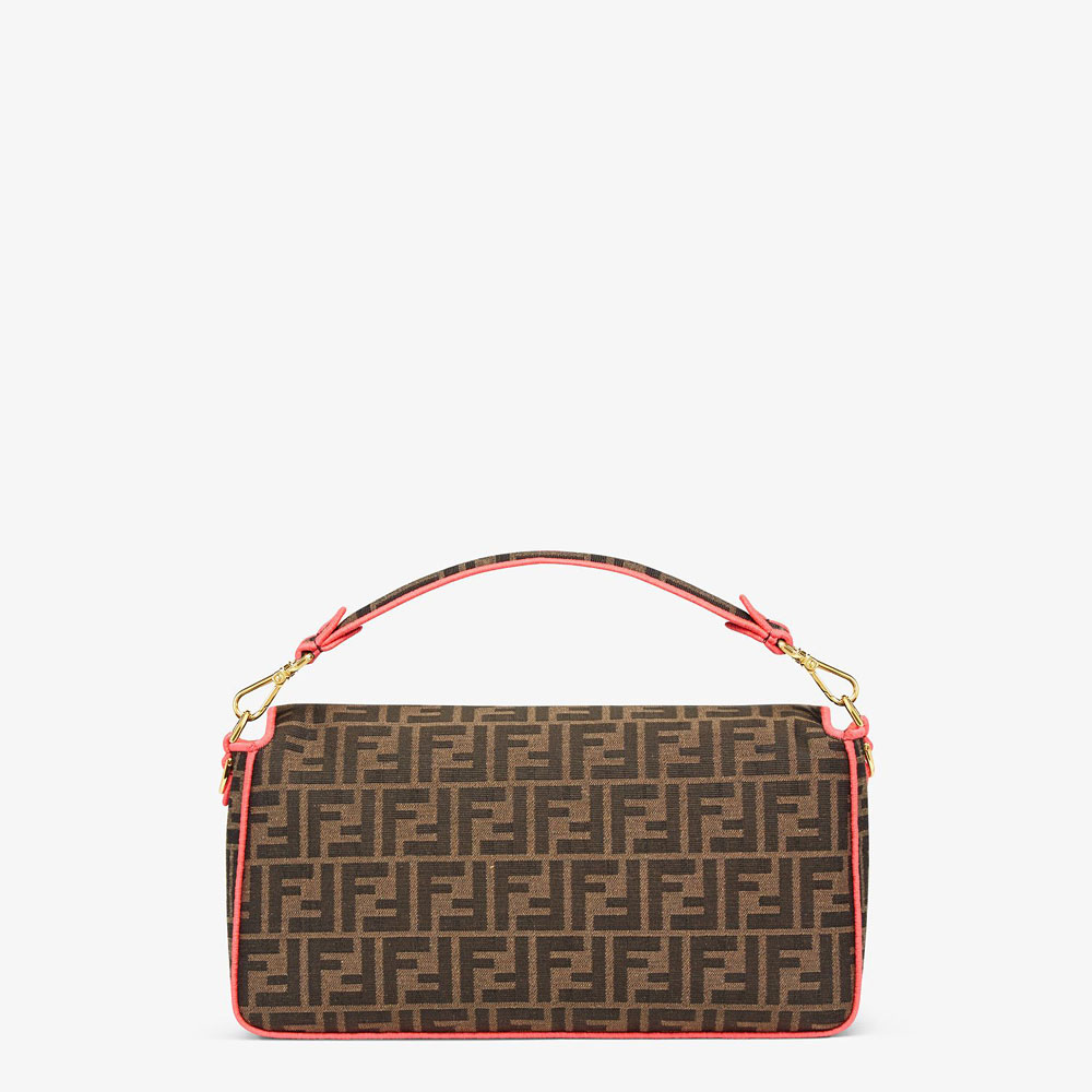 Iconic large Baguette bag made of brown jacquard fabric with an FF motif, decorated with an FF clasp and trimmed with neon pink embroidery.
