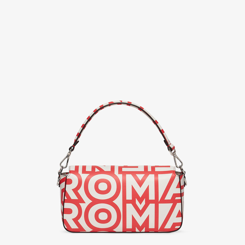 Iconic medium Baguette bag made of leather printed with the Fendi Roma logo in white and red. Reinterpreted by Marc Jacobs in an all-over.