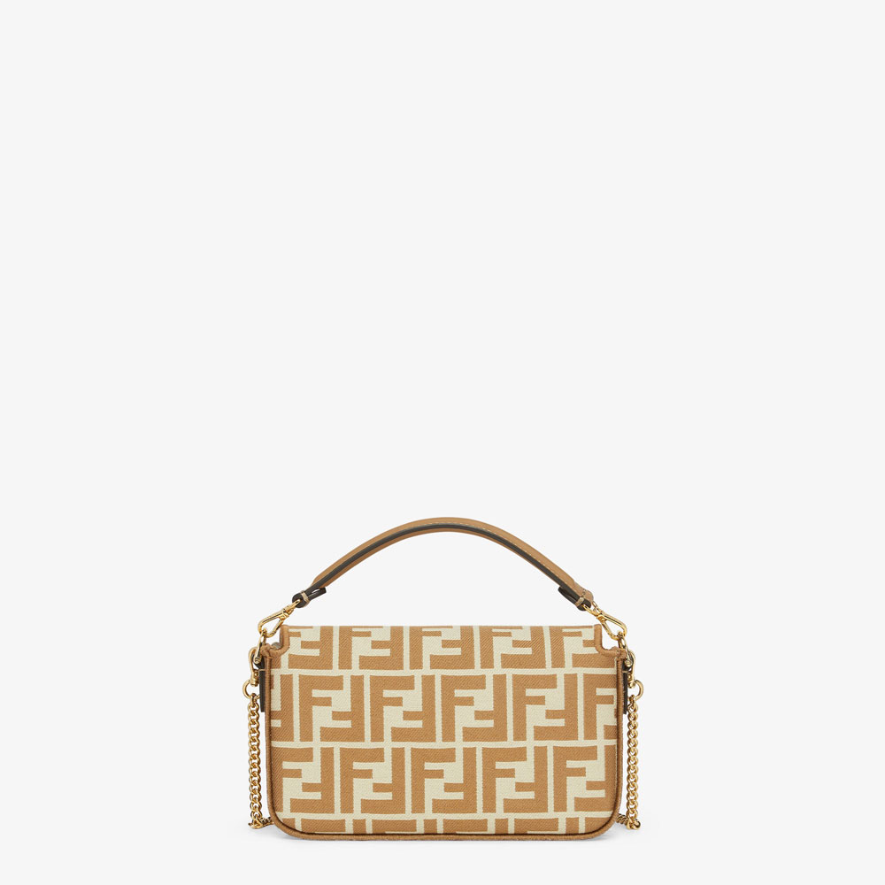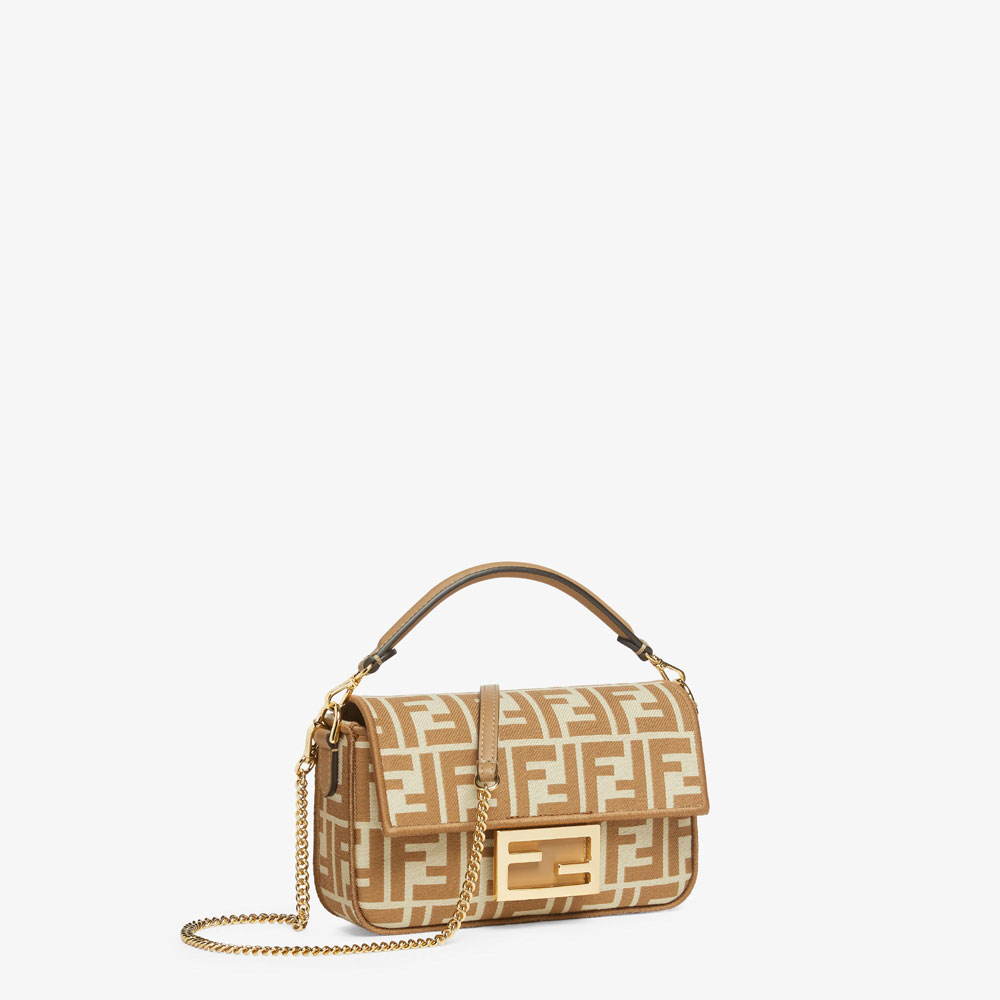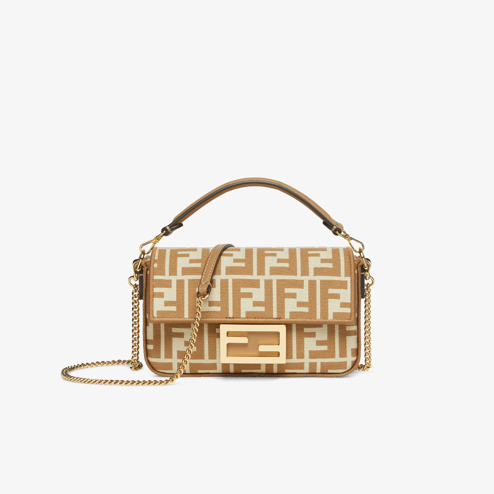 Iconic small Baguette bag made of jacquard fabric with the iconic FF motif in shades of beige, embellished with beige embroidered borders, beige leather details and embellished with an FF clasp.Featuring a front flap, magnetic clasp