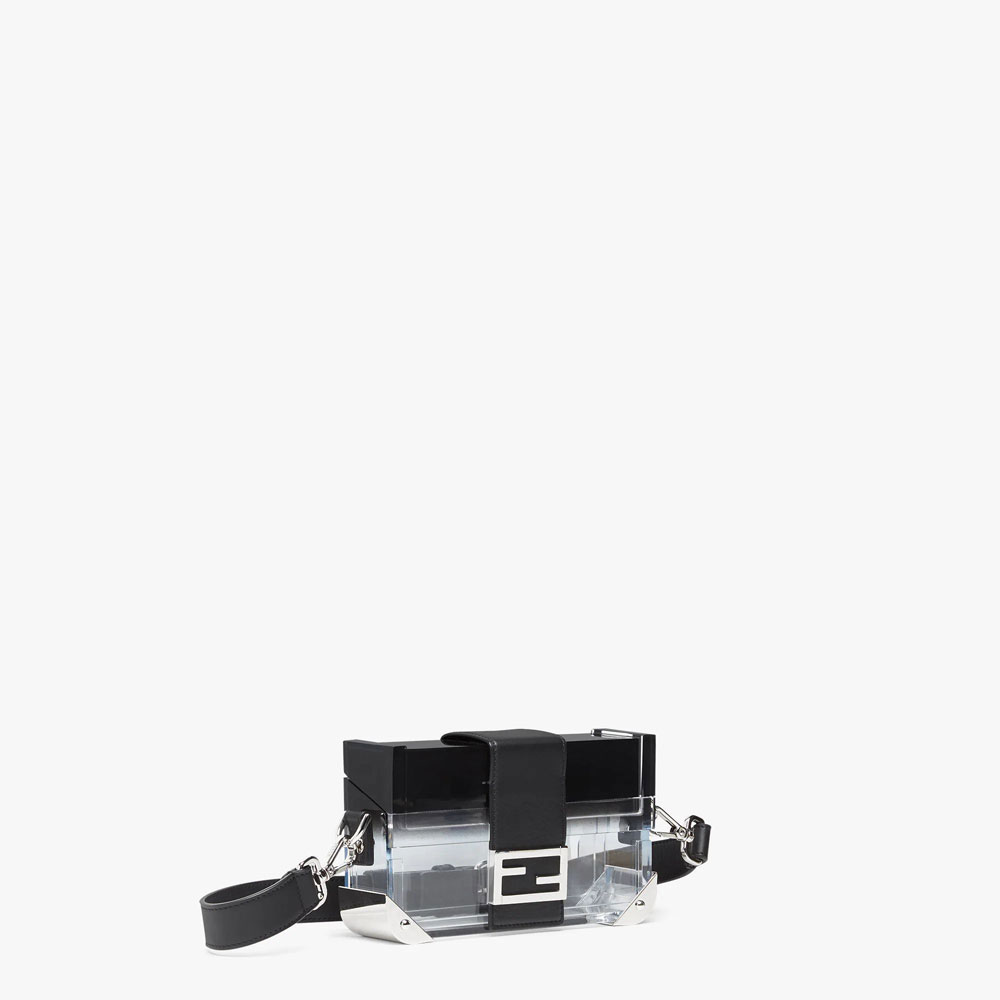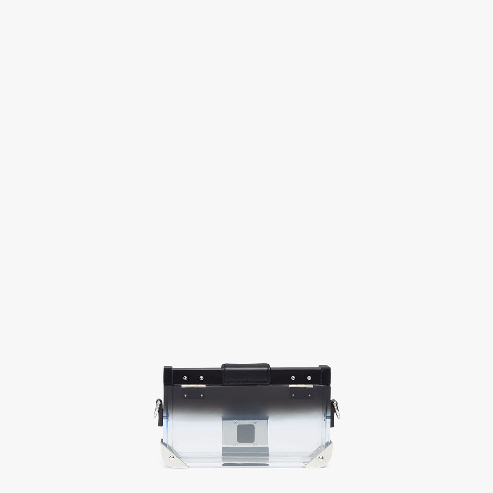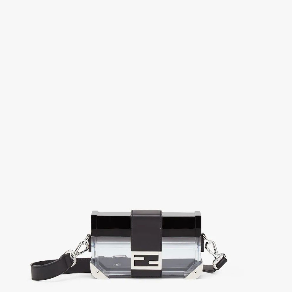 Rigid Baguette bag made of transparent plexiglass with black gradient effect. Square flap and magnetic FF clasp. Embellished with metal corners and black leather details.