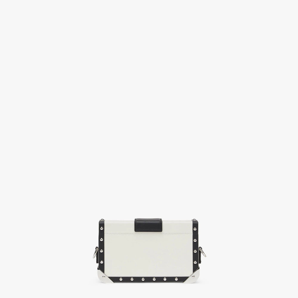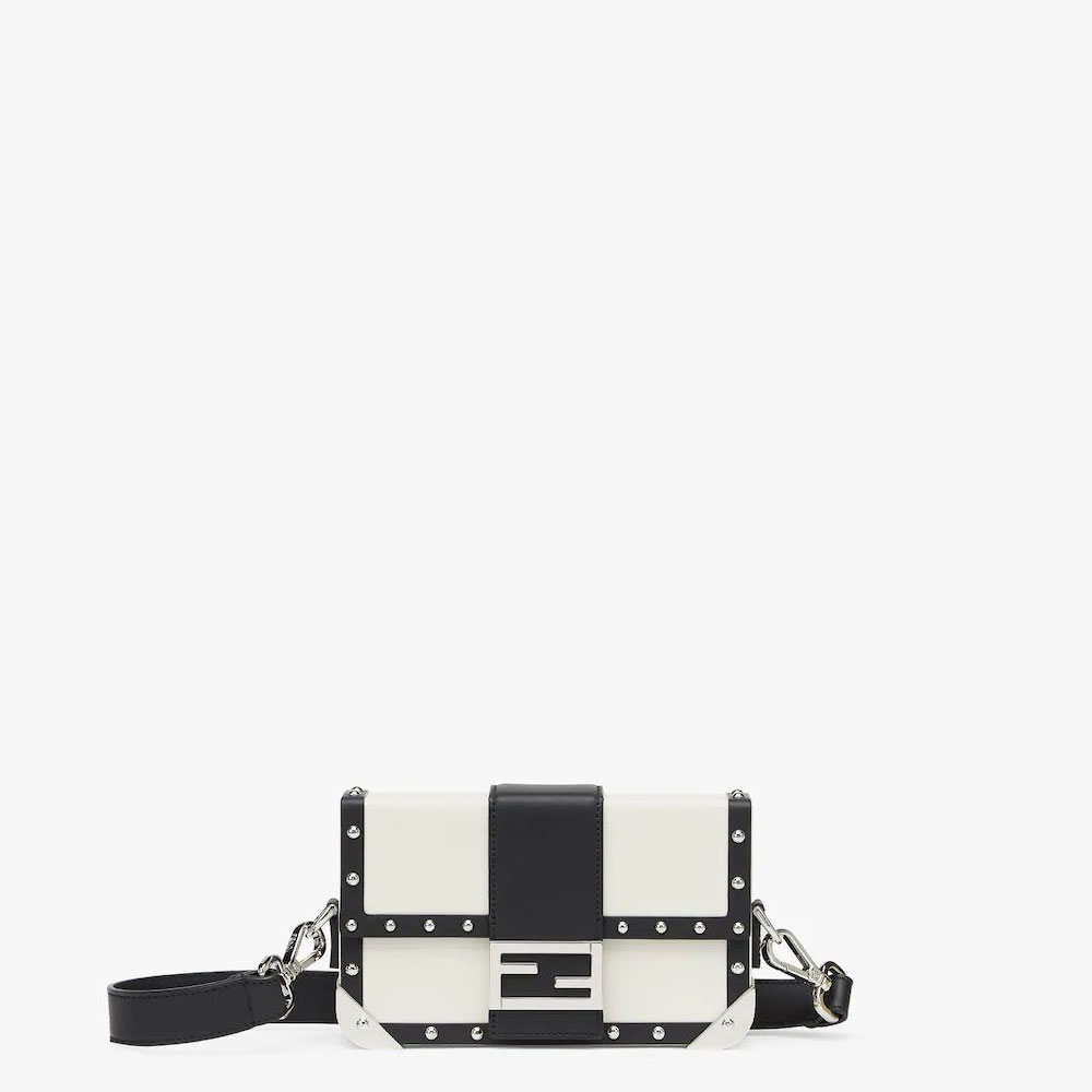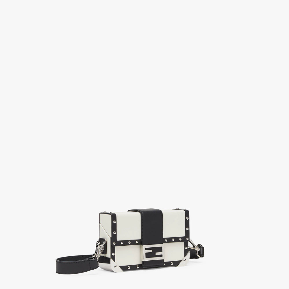 Rigid Baguette bag made of white leather with square flap and FF magnetic clasp. Finished with metal rivets and black leather details.