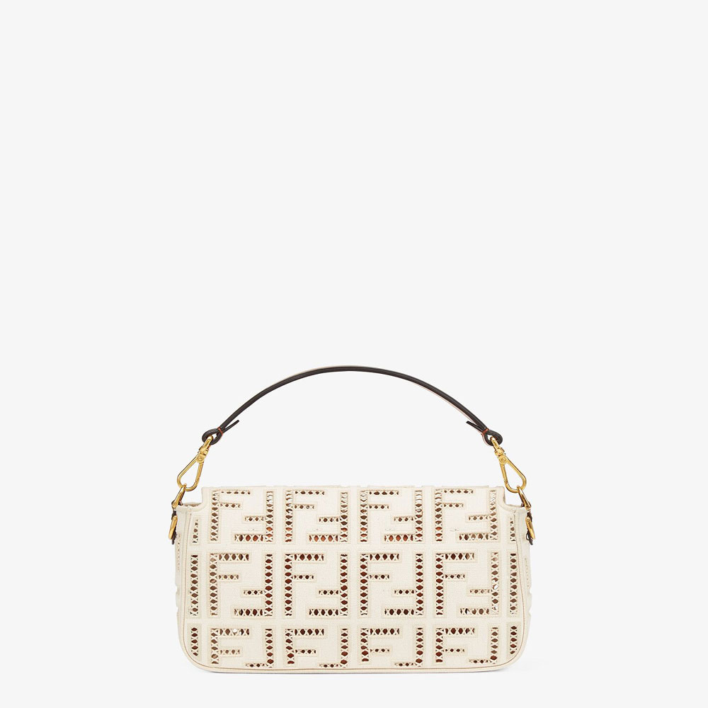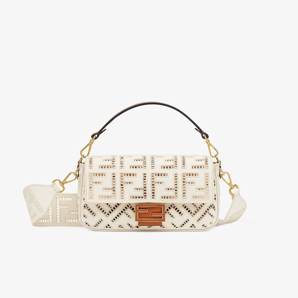 Iconic Baguette bag made of undyed canvas with a jour embroidered FF motif. Finished with natural leather details and embellished with an FF clasp.