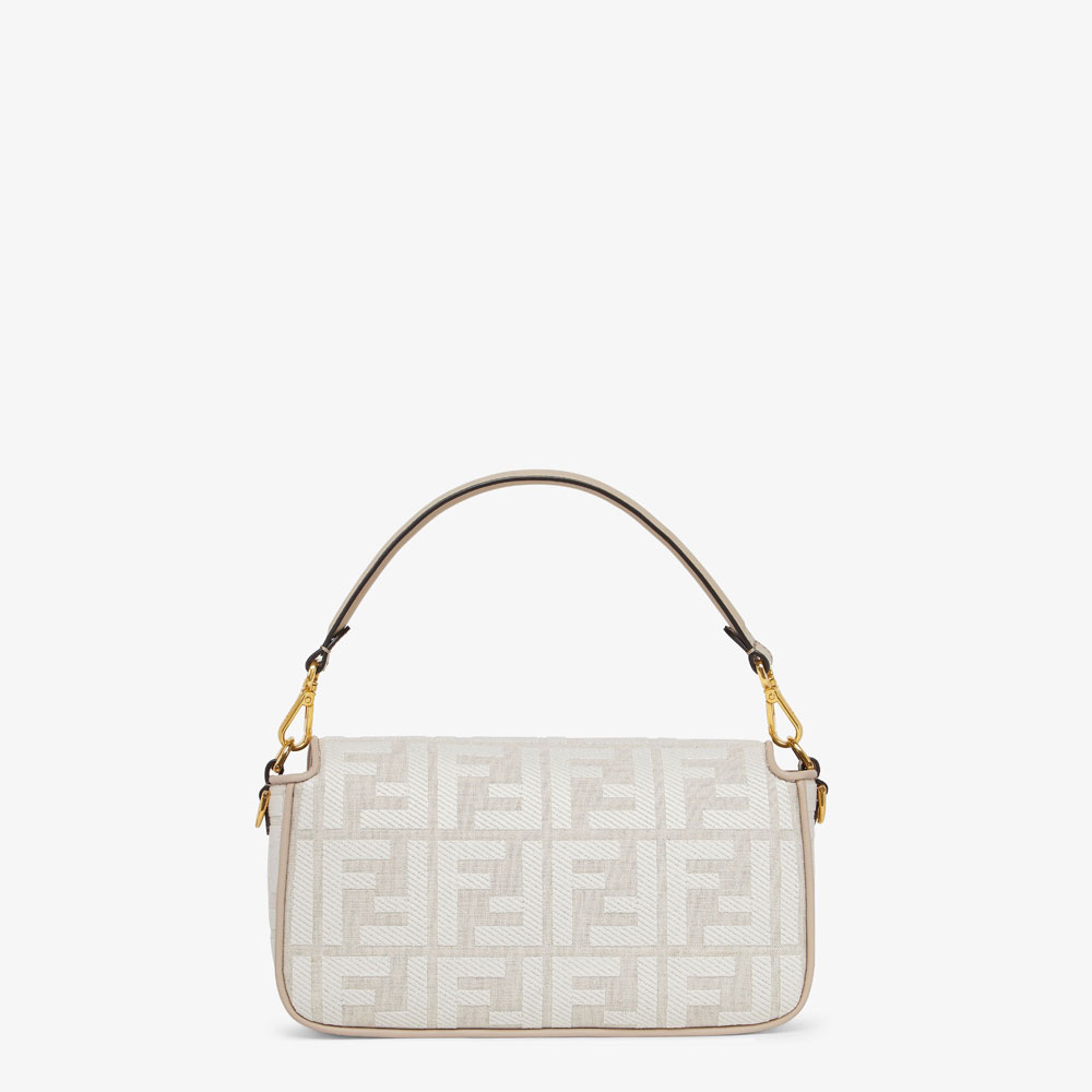 Iconic medium Baguette bag made of white canvas with a tone on tone embossed embroidered FF motif created trimmed in grey leather and embellished with an FF clasp.