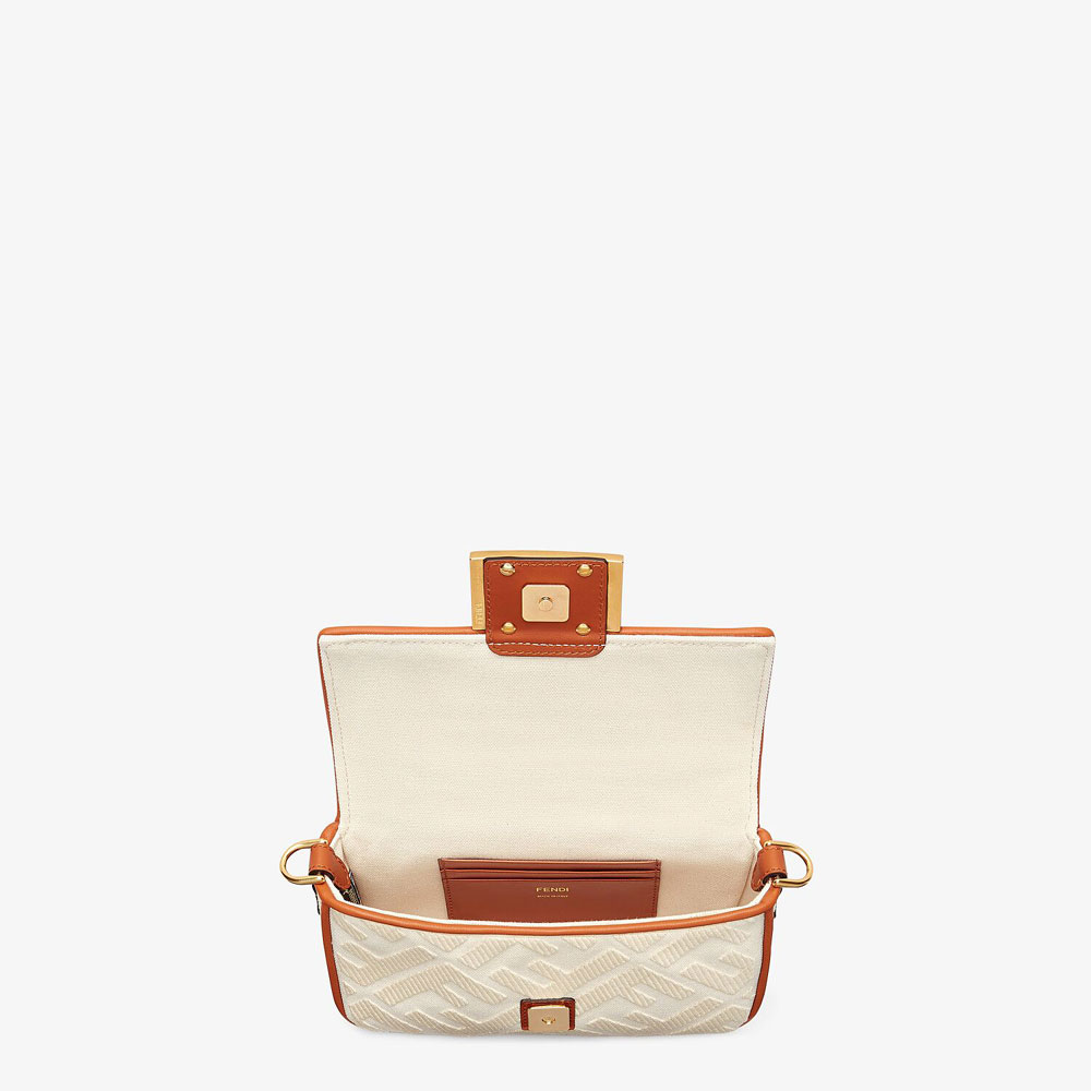 Mini iconic Baguette bag made of undyed canvas with an embossed FF motif created with tone on tone embroidery, trimmed in brown leather and adorned with an FF clasp.
