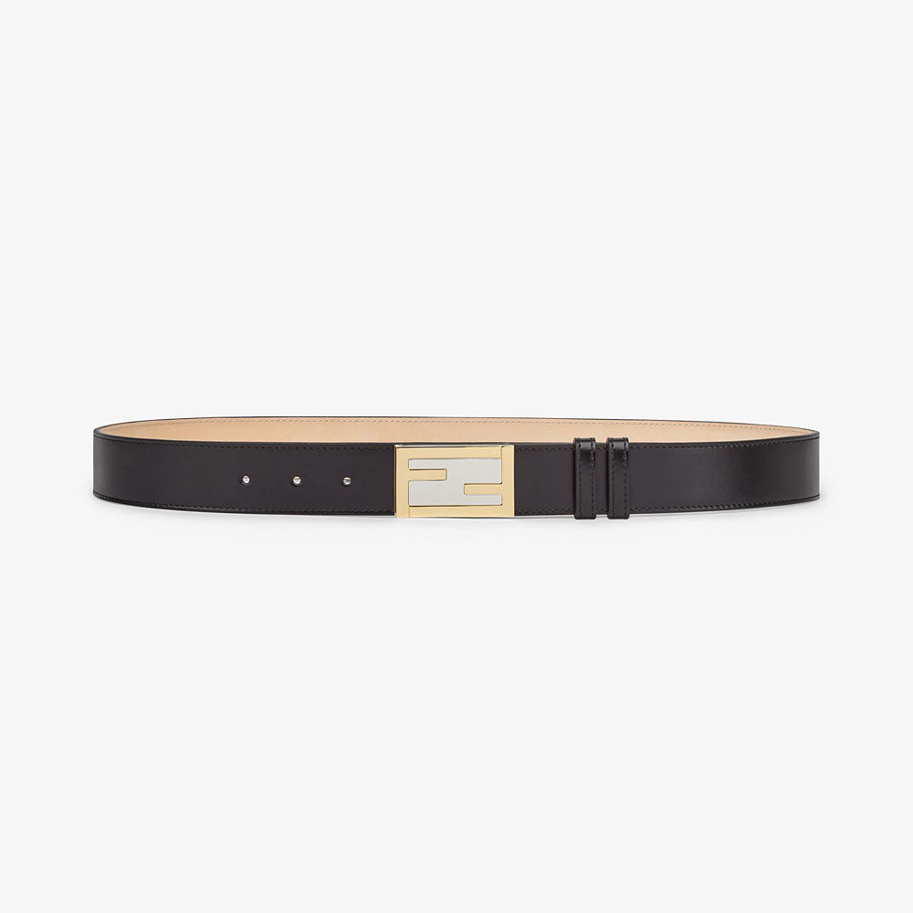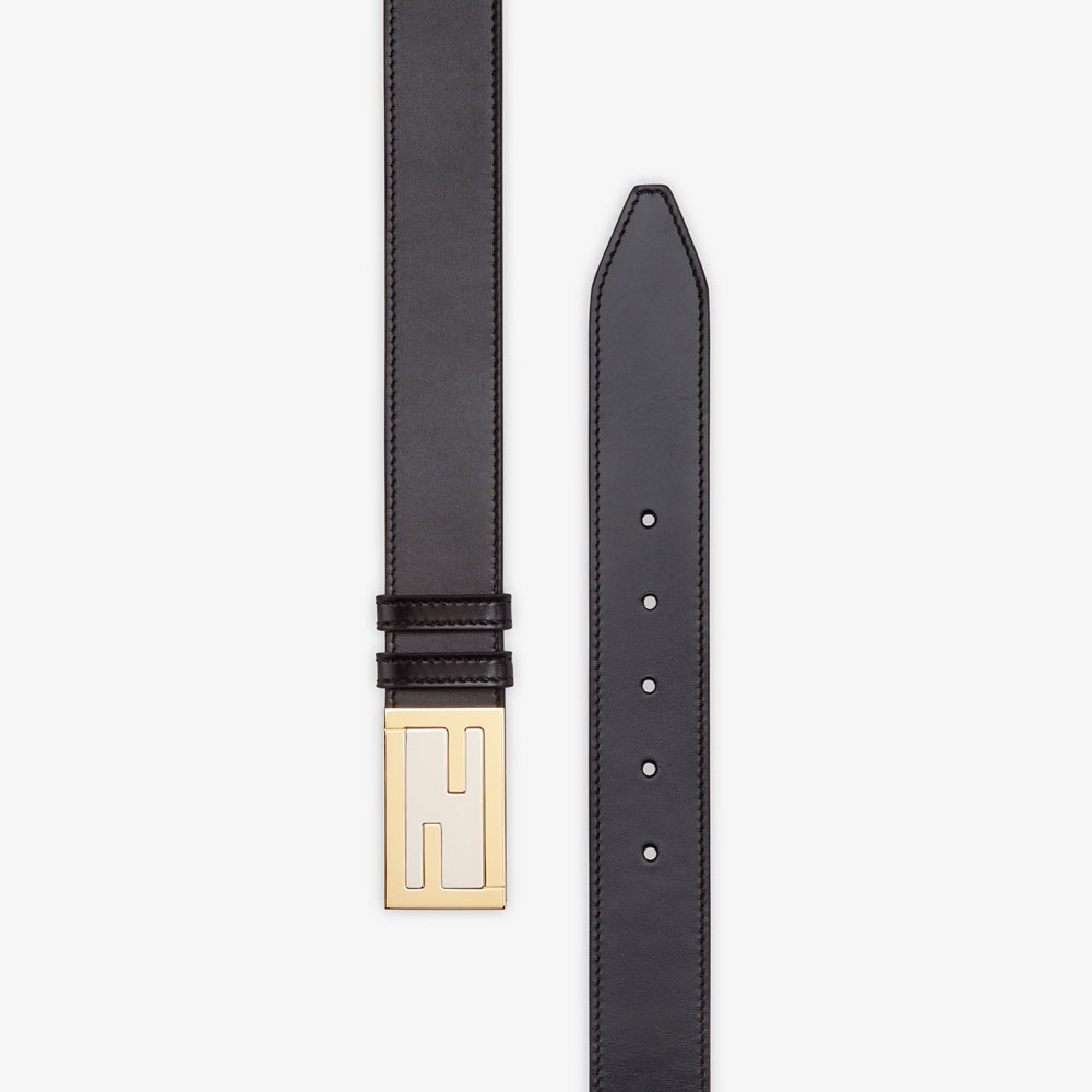 Belt with two loops. FF Baguette buckle with stud fastening. Made of soft black leather. Metalware in a combination of palladium and gold finishes.