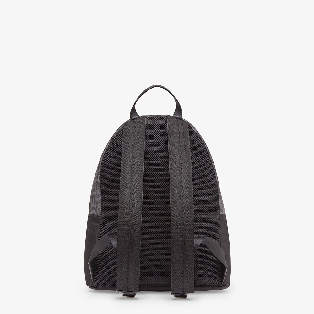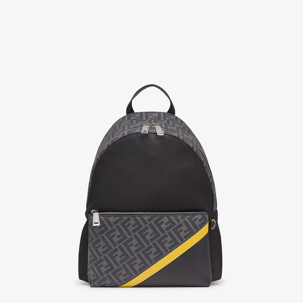 Large backpack with front pocket. Breathable technical mesh back and adjustable shoulder straps. Zip fastening with double slider and inside pocket. Made with black nylon. Embellished with grey textured weave fabric with FF motif. Pocket with black leather insert and inlaid detail in yellow. Palladium-finish metalware.