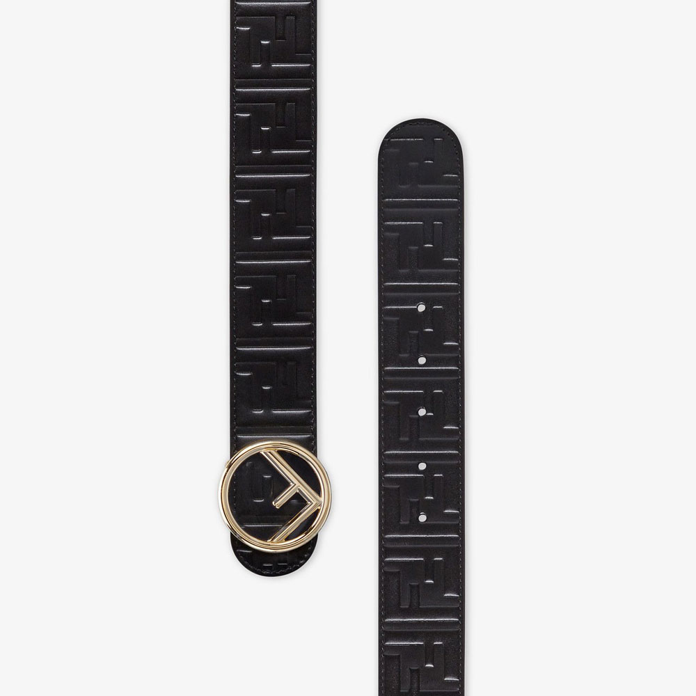Wide belt with buckle in the new Fendi logo shape. Stud buckle fastening. Made of black calfskin. The FF pattern is created in a raised print. Gold-finish metalware.