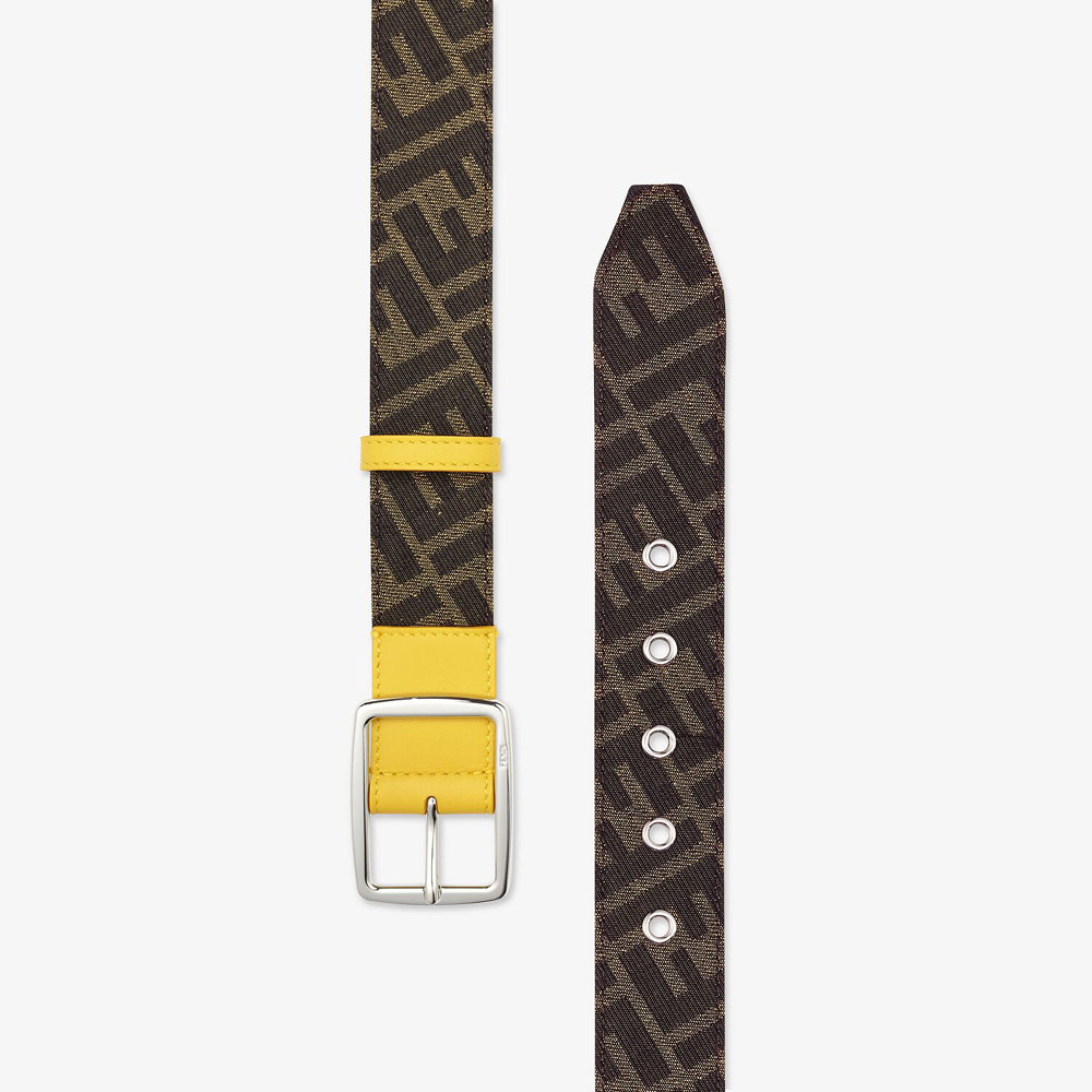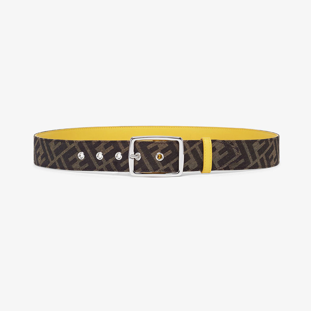 Belt with single loop. Pin buckle with metal eyelets. Made of fabric with diagonal jacquard FF motif. Leather lining in shades of yellow. Palladium-finish metalware.