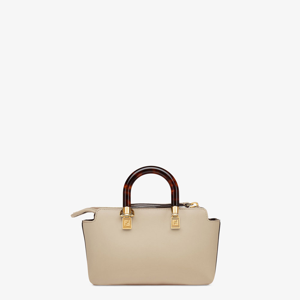Iconic mini By The Way Boston bag made of dove grey leather with hot-stamped FENDI ROMA lettering and stiff tortoiseshell-effect plexiglass handles
