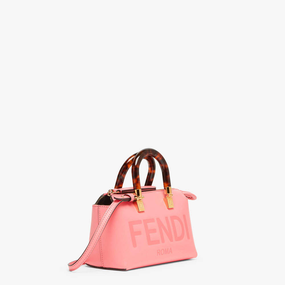 Iconic mini By The Way Boston bag made of pink leather with hot-stamped FENDI ROMA lettering and rigid tortoiseshell-effect plexiglass handles.