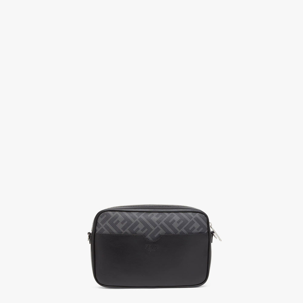 Compact shoulder bag with zip closure. The tech fabric cross-body shoulder strap with "FENDI" branding is adjustable and detachable. Made of textured fabric with a black and grey FF motif and FENDI ROMA print. Embellished with black leather details. Interior organised with a flat pocket. Palladium-finish metalware.