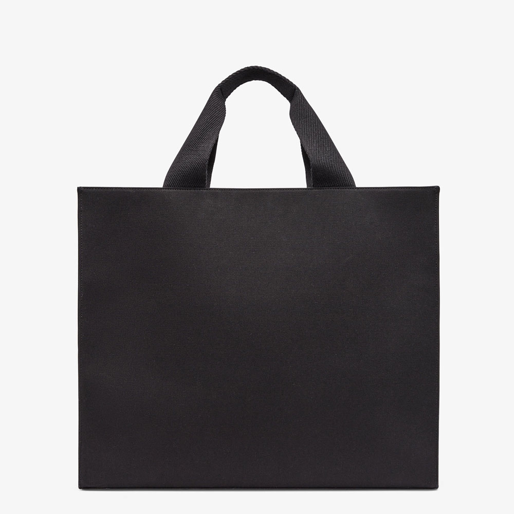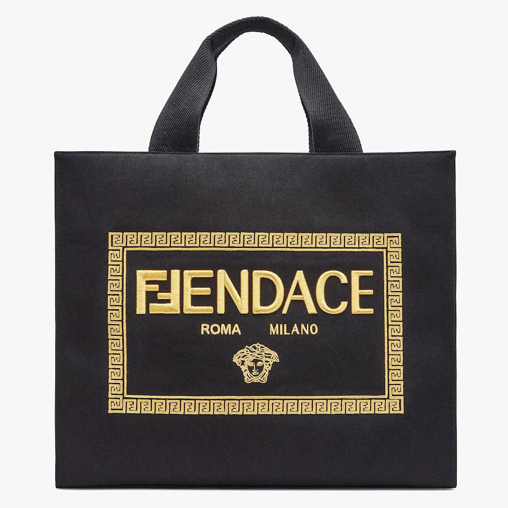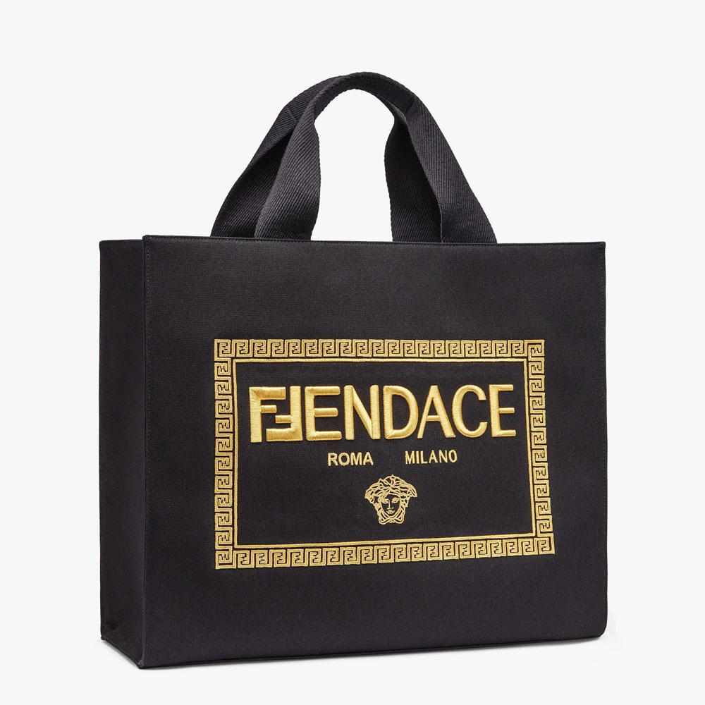 Roomy shopper made of black canvas. The gold-thread embroidery depitcts the Fendace logo. a symbol of the collection born of the creative collaboration between Fendi and Versace.