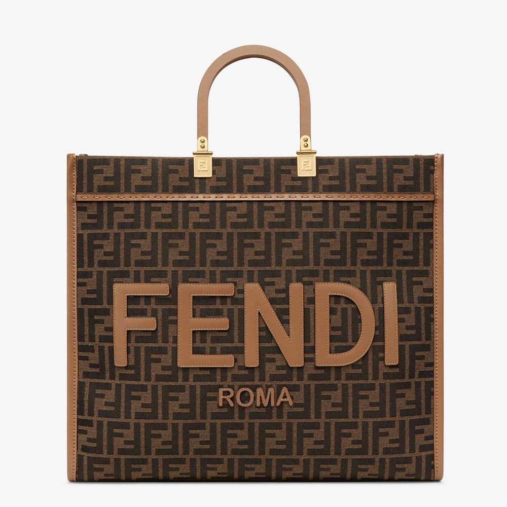 Sunshine Shopper bag made of fabric with brown FF jacquard motif and FENDI ROMA lettering in light brown leather and stiff leather handles.Features a spacious lined internal compartment, light brown leather edging and gold-finish metalware.Can be carried by hand with the two handles, and two inner hooks allow you to attach a shoulder strap. Size:40.5 x 35 x 21.5CM
