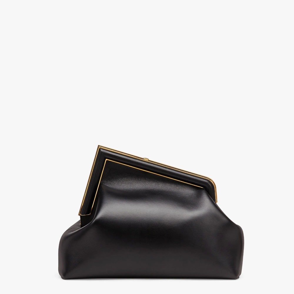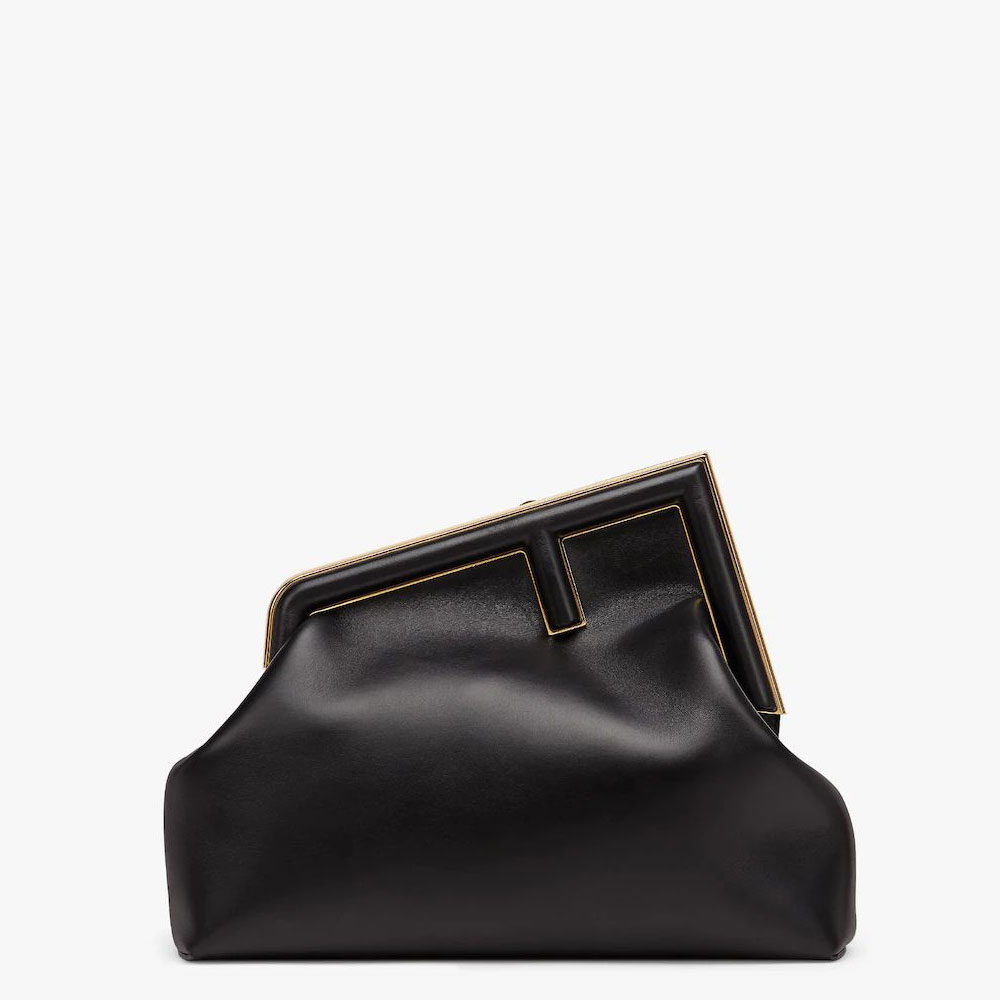 Medium Fendi First bag made of soft. black nappa leather with oversized metal F clasp bound in tone on tone nappa leather. Featuring an interior compartment lined in fabric with the iconic FF motif. removable inner hooks and gold-finish metalware. Can be carried by hand as a clutch or worn on the shoulder thanks to the detachable shoulder strap. Size:W32.5 x H23.5 x D15cm