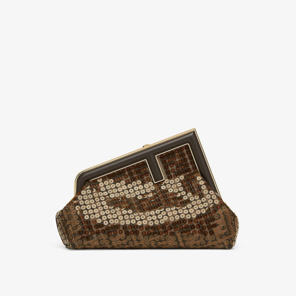 Small Fendi First bag made of fabric with a jacquard FF motif embroidered all-over with shiny transparent sequins. Oversized F metal clasp bound in dark brown nappa leather.