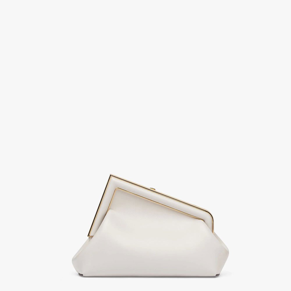 Small Fendi First bag in light grey soft nappa leather with an oversized F metal clasp with tone on tone nappa leather bands. Featuring an internal fabric-lined compartment with the iconic FF motif. removable inner hooks and gold-finish metalware. Can be carried by hand like a clutch or worn on the shoulder thanks to the detachable shoulder strap. Size:W26 x H18 x D9.5cm