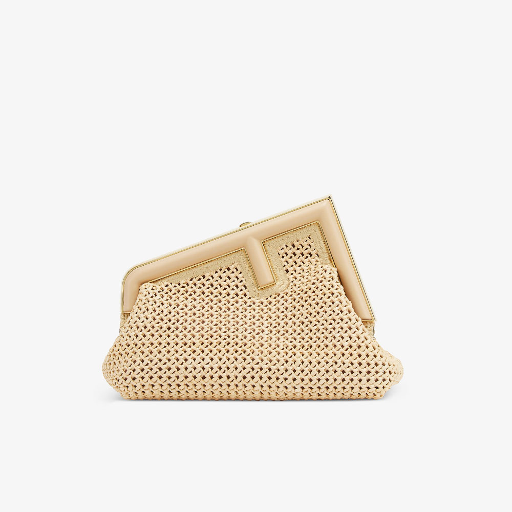 Small Fendi First bag in an elegant, refined design featuring an oversized F-shaped clasp.Made of natural-colored macrame raffia with an oversized metal F bound in tone-on-tone nappa leather.
