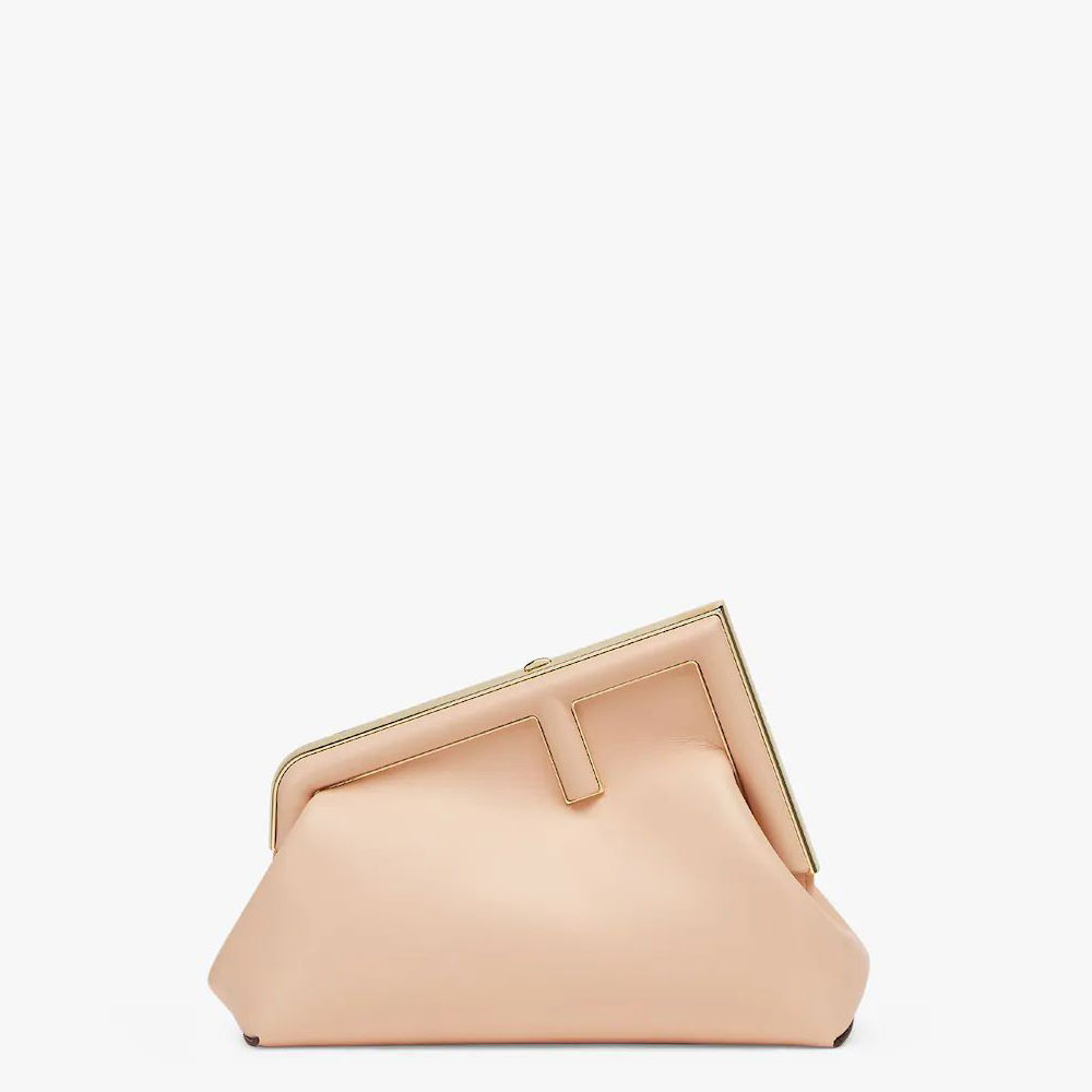 Small Fendi First bag made of soft. pale pink nappa leather with oversized metal F clasp bound with tone on tone nappa leather. Featuring an interior compartment lined in fabric with the iconic FF motif. removable inner hooks and gold-finish metalware. Can be carried by hand as a clutch or worn on the shoulder thanks to the detachable shoulder strap. Size:W26 x H18 x D9.5cm