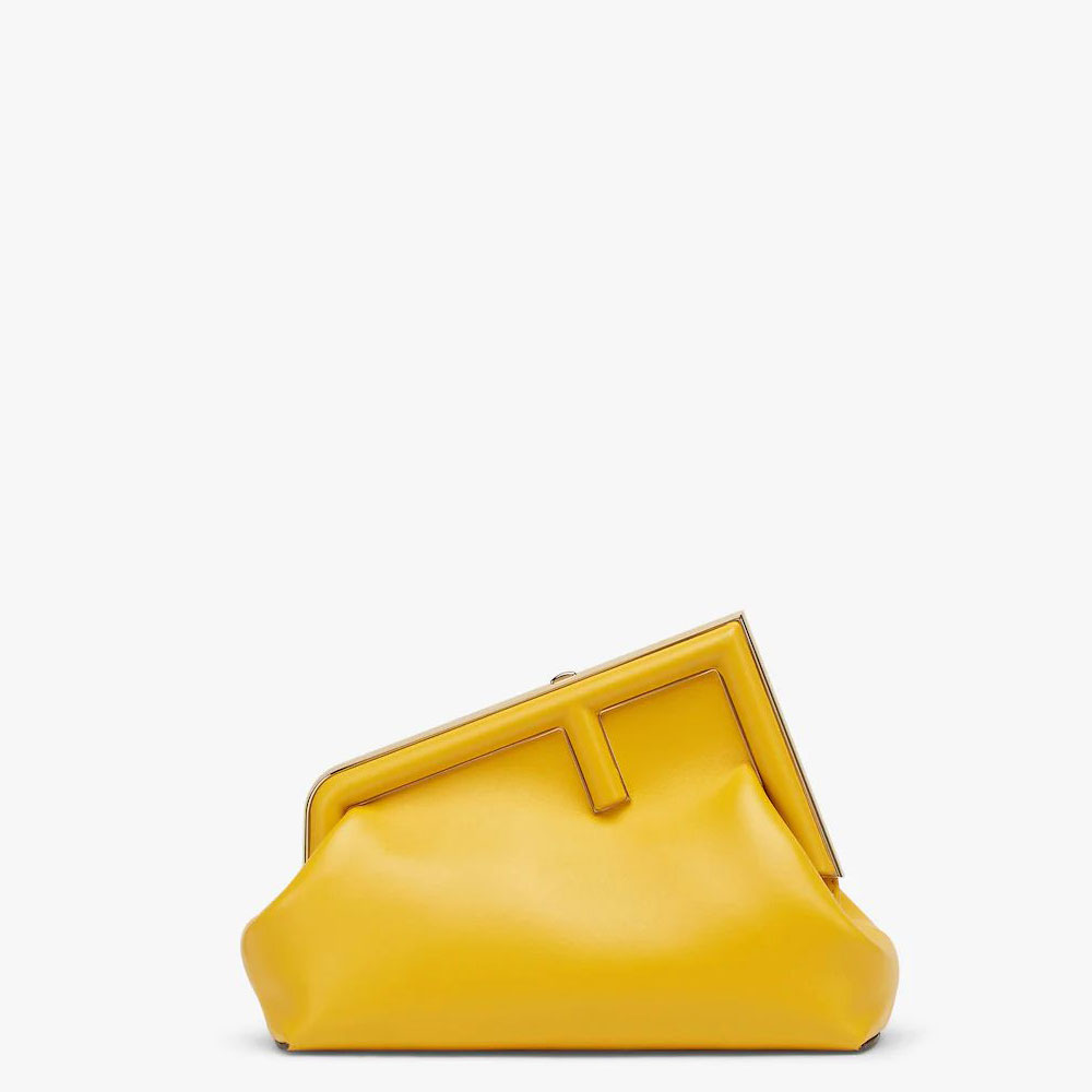 Small Fendi First bag made of soft. yellow nappa leather with oversized metal F clasp bound in tone on tone nappa leather. Featuring an interior compartment lined in fabric with the iconic FF motif. removable inner hooks and gold-finish metalware. Can be carried by hand as a clutch or worn on the shoulder thanks to the detachable shoulder strap. Size:W26 x H18 x D9.5cm