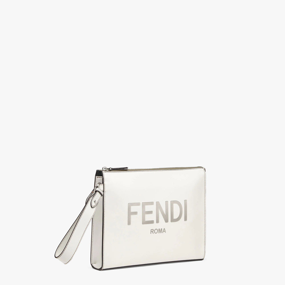Light grey leather clutch embellished with hot-stamped FENDI ROMA lettering.