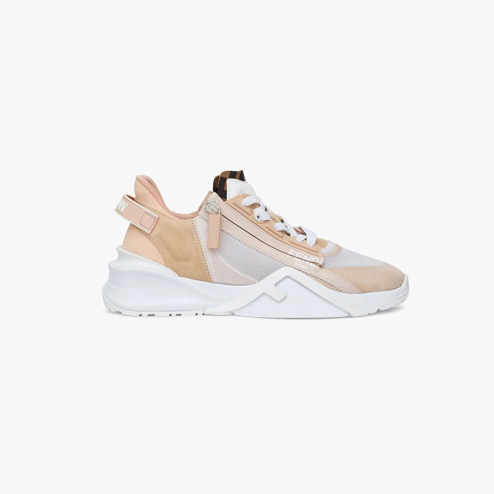 Presented during the Fendi Mens Autumn Winter 2020 Fashion Show. Fendi Flow sneakers feature a close-fitting. supported design that adapts perfectly to both the male and the female wardrobe. The upper has adjustable. elastic laces and a side zip for taking them on and off comfortably and quickly. The FF motif on the edge of the tongue and the rubber tab on the heel with raised Fendi lettering are iconic. distinctive details. They are completed by the 35 mm rubber running sole decorated with a diagonal. engraved F. This style is made of nylon and suede in shades of pink and white and is designed for the Womens collection. Mode:8E8035 EKV F1C3Y